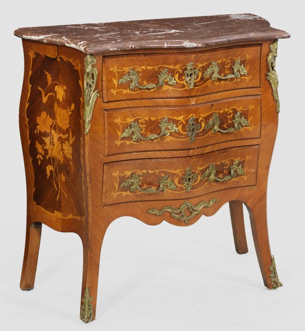 Pfeilerkommode im Louis XV-Stil Mahagoni, furniert sowie Einlagen aus Palisander und Ahorn. Dreiseitig bombierter Korpus, flankiert von schmalen Ecklisenen, in hohe, ausgestellte Beine übergehend. In der gegliederten Front drei Schubladen. Gespiegelt angeordnete, von Rocaillen gerahmte Furnierfelder mit Blüteneinlagen. Profilgerahmte Deckplatte aus bordeaux-rotem, weiß gemasertem Marmor. H. 85,5 cm. 86 cm x 40 cm.