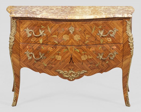 Elegante Kommode im Louis XV-Stil Rosenholz, furniert sowie Einlagen aus teilw. rot und grün gefärbten Edelhölzern. Dreiseitig bombierter Korpus, flankiert von weit ausgezogenen Ecklisenen, in ausgestellte Beine übergehend. In der gegliederten Front zwei breite, optisch verbundene Schubladen sans traverse. Flächendeckend gespiegelt angeordnete Furnierfelder mit Blütenmarketerie. Profilierte Deckplatte aus cremefarbenem, violett- und beigefarben gemasertem Marmor. H. 83 cm. 118 cm x 55 cm.