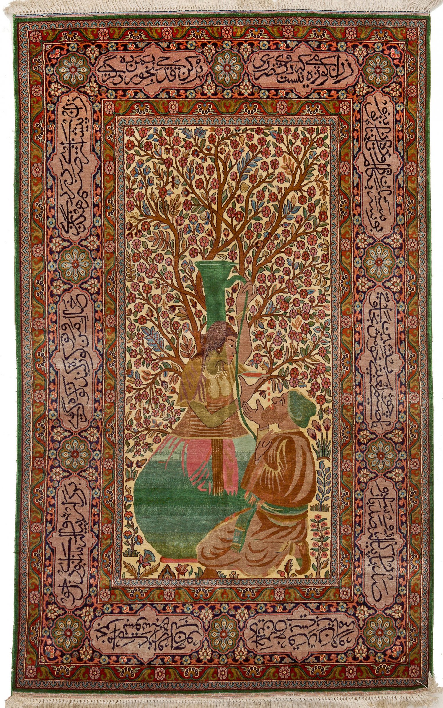Kleiner Kaschmir-Bilderteppich Indien. Seide auf Baumwolle. Im elfenbeinfarbenen Innenfeld flächendeckendes Baummotiv sowie Figurenstaffage. Umlaufend breite, dunkelblaue Bordüre mit roséfarbenen Kalligraphie-Kartuschen. 155 cm x 90 cm.
