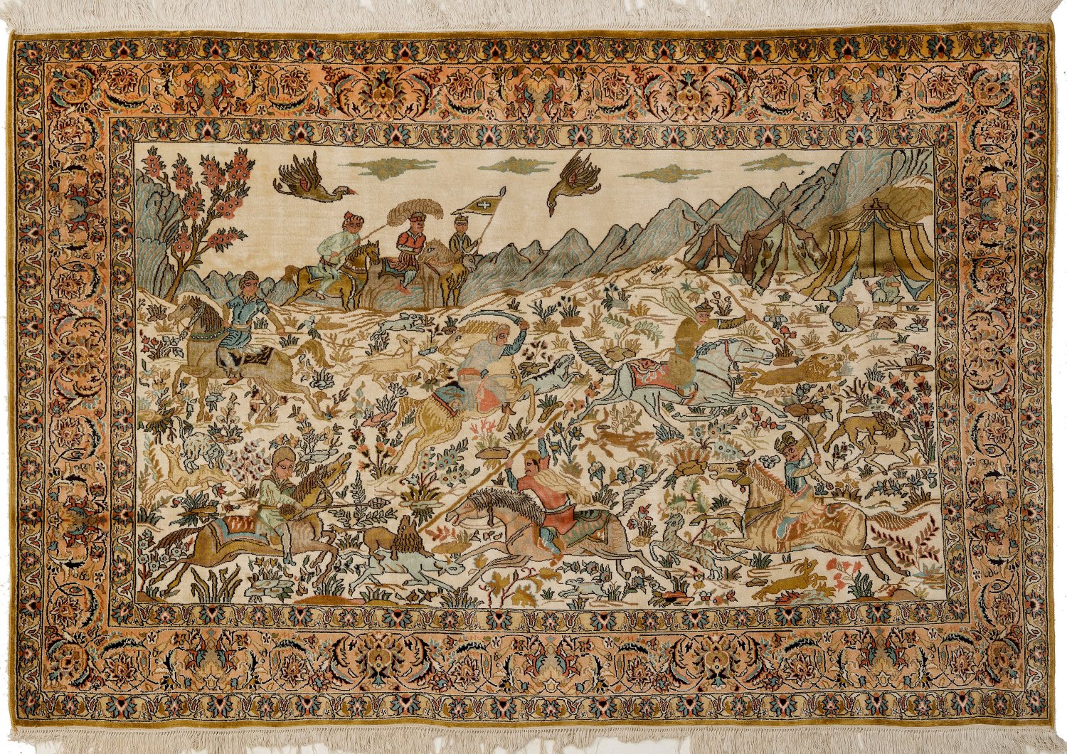 Kaschmir-Jagdteppich Indien. Seide auf Seide. Sehr feine Knüpfung. Querformat. Im elfenbeinfarbenen Innenfeld flächendeckende, szenisch angelegte Landschaftsdarstellung mit unterschiedlichen Jägern und Wildtieren. Umlaufend apricotfarbene Bordüre aus Palmettenranken. 120 cm x 180 cm.