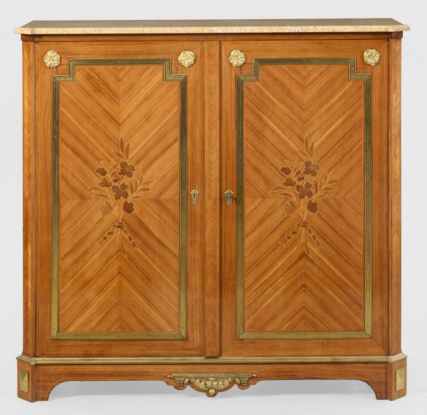 Eleganter Louis XVI-Salonschrank Rosenholz, furniert sowie Einlagen aus unterschiedlichen Edelhölzern. Gerader, rechteckiger Korpus, flankiert von schmalen, schräggestellten Ecklisenen auf profilgerahmter Zarge und gesägten Füßen. In der gegliederten Front zwei große Türen mit intarsierten Blüten. Flächendeckend gespiegelt angeordnete Furnierfelder schauseitig von breiten, applizierten Bändern begrenzt. Gering überstehende Deckplatte aus cremefarbenem Marmor. Innen variable Facheinteilung. H. 128 cm. 135 cm x 40 cm.
