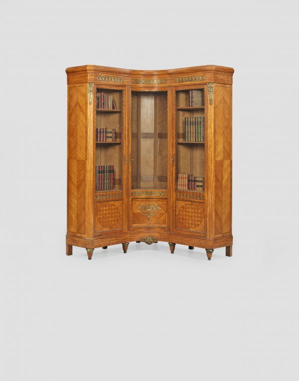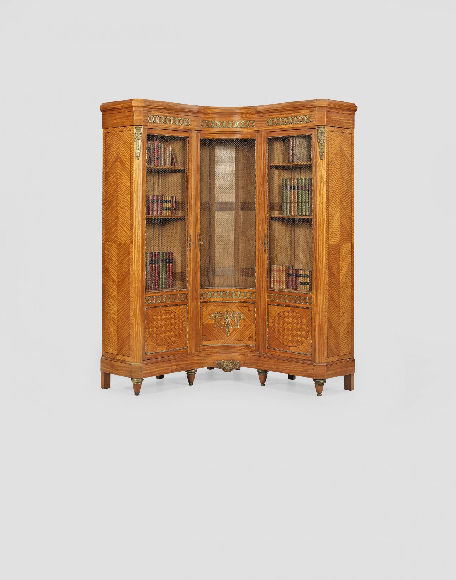 Großer Louis XVI-Bibliotheksschrank Satinholz, furniert. Gerader, hochrechteckiger, über Eck gearbeiteter Korpus, flankiert von schräggestellten Ecklisenen auf Balusterfüßen. In der gegliederten Front drei teilw. konkav eingezogene Türen mit Gittereinsätzen. Flächendeckend gespiegelt angeordnete Furnierfelder, teilw. mit Reserven aus Rautenmarketerie. Reiche Applikationen aus vergoldeter Bronze. H. 240 cm. Schenkel-T. 152 cm.