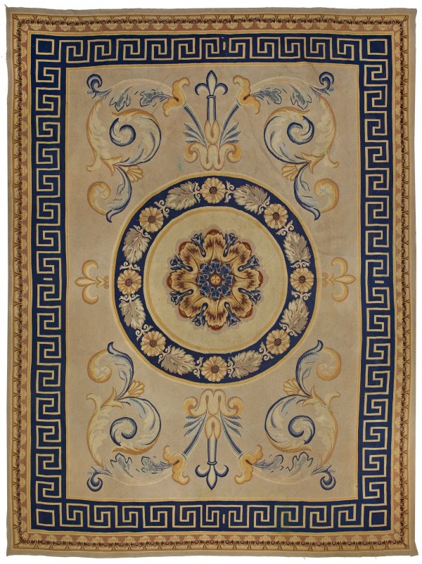 Aubusson-Salonteppich 2. Hälfte 20. Jh.; Wolle auf Wolle, flach gewebt. Auf beigefarbenem Fond zentrales Medaillon mit großer Blattrosette, begrenzt von Akanthusranken. Umlaufend blattgerahmte dunkelblaue Mäanderbandbordüre. 365 cm x 273 cm.