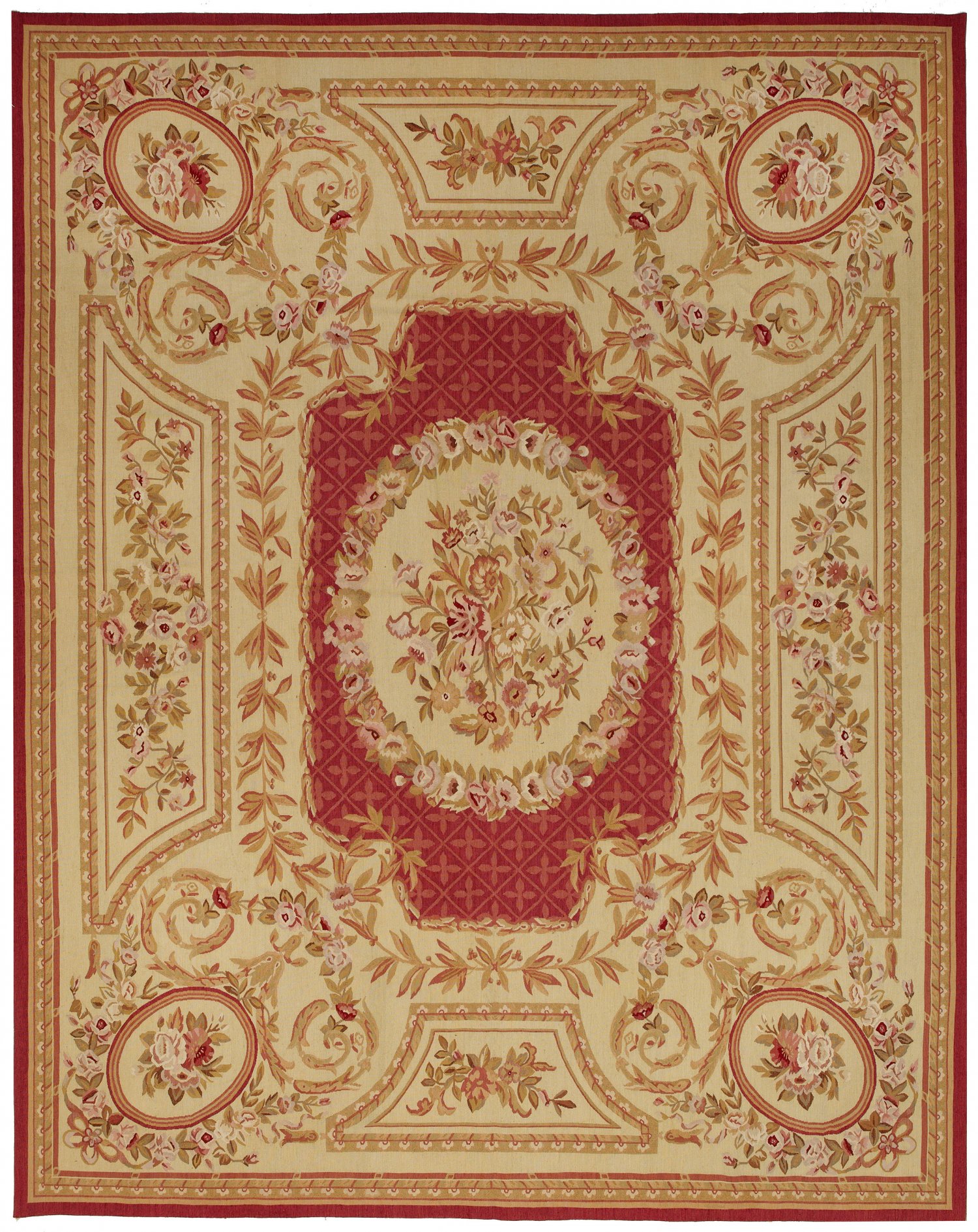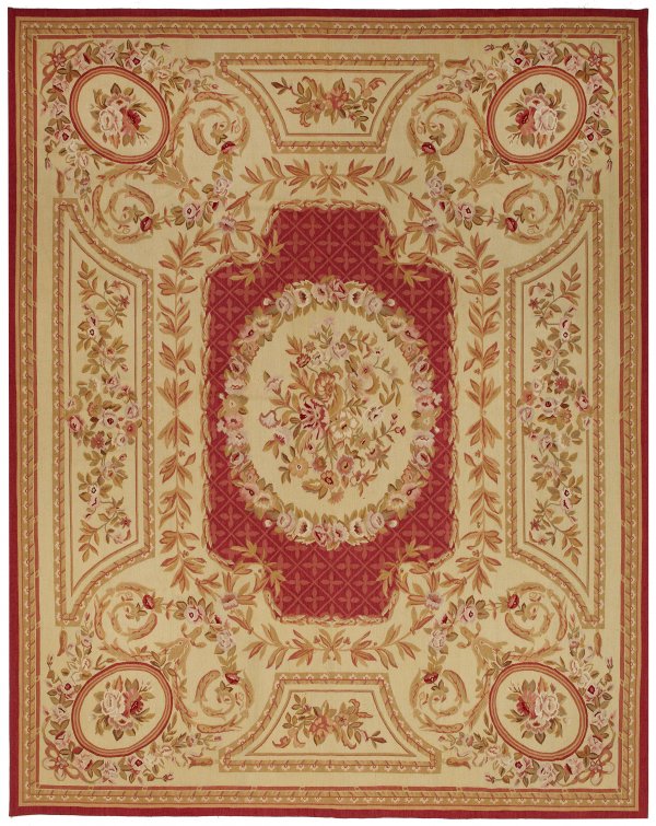 Aubusson-Salonteppich 2. Hälfte 20. Jh.; Wolle auf Wolle, flach gewebt. Auf beigefarbenem Fond große, gestreckte, rotgrundige Kartusche aus Gitterwerk sowie Ovalmedaillon aus Rosenblüten. Breite Rahmung aus von schmalen Bordüren begrenzten Reserven und Medaillons mit Blütendekor in Pastelltönen. 306 cm x 240 cm.