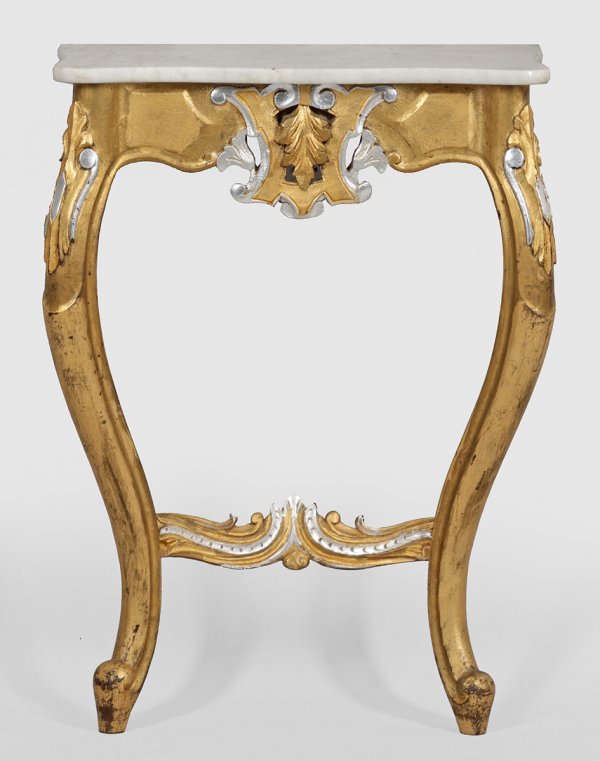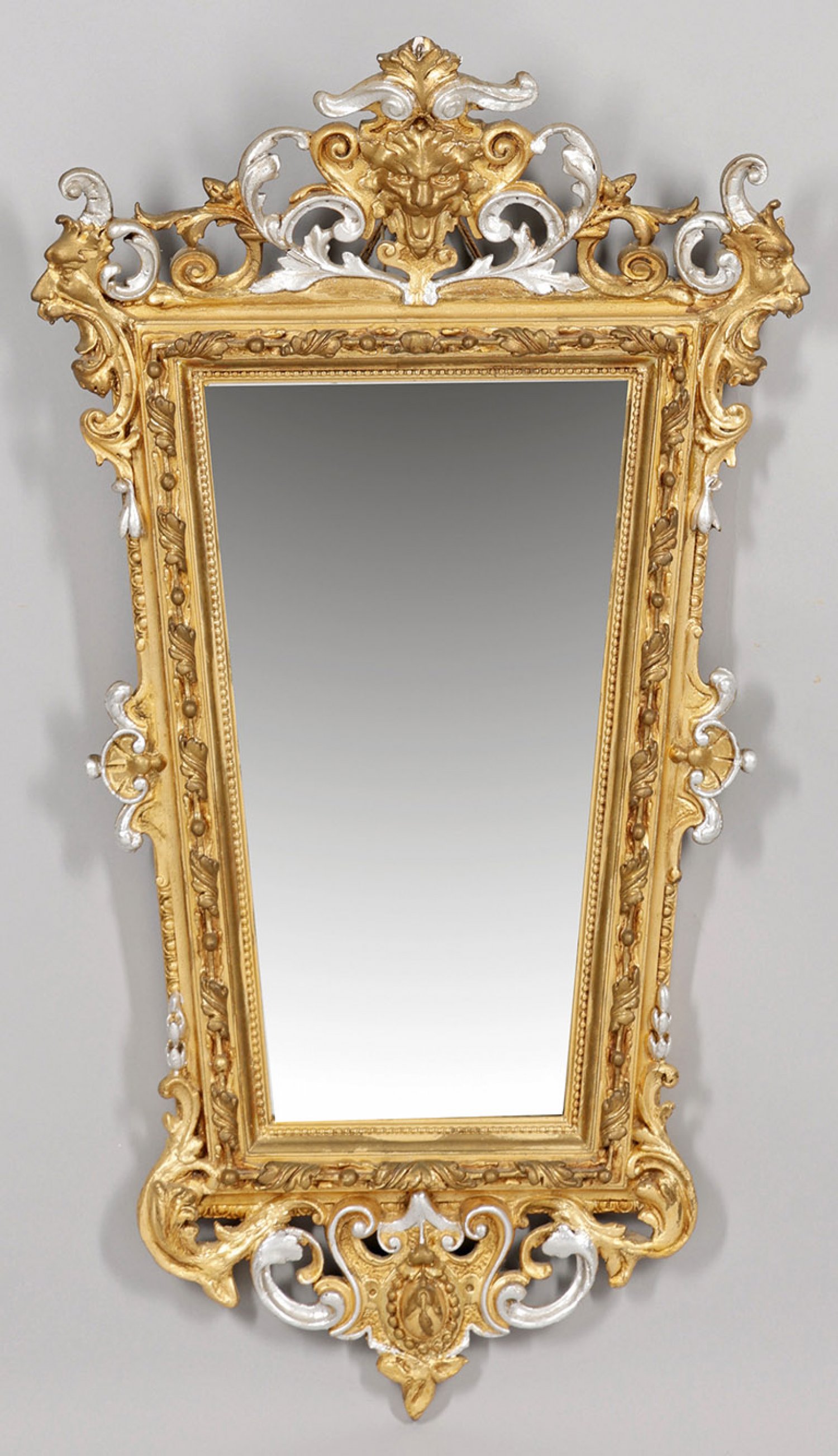 Belle Epoque-Wandspiegel mit Konsole Holz, stuckiert, gefasst und vergoldet bzw. teilw. versilbert. Profilierte, trapezförmige Spiegelrahmung aus Blattwerk. Durchbrochen gearbeitete, leicht vorkragende Bekrönung aus Löwenmaskarons und Blattvoluten sowie korrespondierender unterer Abschluss. Facettiertes Spiegelglas. Passig geschweifte Zarge mit zentraler Blattkartusche auf Volutenbeinen. Rest.; Spiegel 115 cm x 63 cm. Konsolen-H. 74 cm. 52 cm x 26 cm.