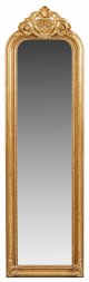 Paar große Pfeilerspiegel Holz und Stuck, vergoldet. Schmale, hochrechteckige, umlaufend breit profilierte Spiegelrahmung mit gewölbtem oberen Abschluss. Durchbrochen gearbeitete Bekrönung aus zentraler Blattkartusche und eingerollten Voluten. Facettiertes Spiegelglas. 219 cm x 63 cm.