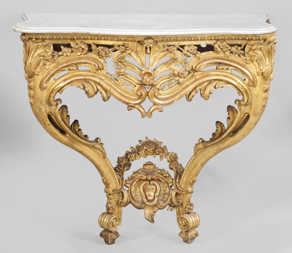 Barock-Konsole Holz, stuckiert, gefasst und vergoldet. Passig geschweifte, durchbrochen gearbeitete Zarge aus großen Blattkartuschen, Blüten und Volutenspangen auf stark geschwungenen Beinen mit üppigem Blattwerk, unterhalb durch kräftiges Kartuschenmotiv verbunden. Gering überstehende Deckplatte aus weißem Marmor. Teilw. besch.; H. 87 cm. 94 cm x 49 cm.