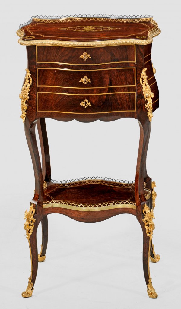 Feines Napoleon III-Salonschränkchen Veilchenholz, furniert sowie Einlagen aus Messing. Allseitig stark bombierter Korpus, flankiert von schlanken Ecklisenen auf hohen, geschwungenen Beinen, unterhalb durch korrespondierendes Ablagefach verbunden. In der gegliederten Front aufklappbare Lade sowie kleines Schubfach. Profilgerahmte Deckplatte mit durchbrochen gearbeiteter Galerierahmung. In der Mitte eingelegte Reserve mit Initiale H. Applikationen aus vergoldeter Bronze. H. 91 cm. 50 cm x 37 cm.