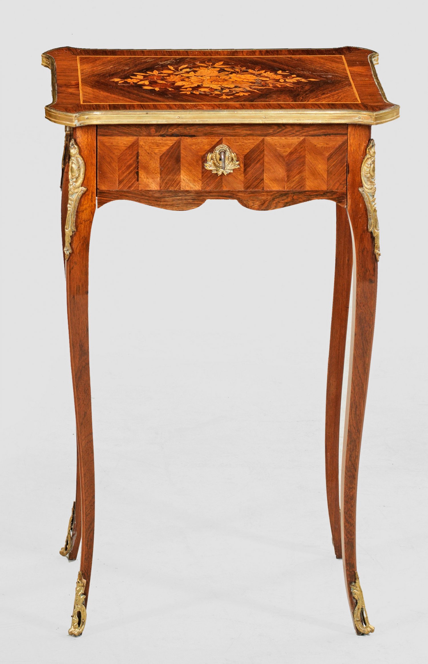 Elegantes Beistelltischchen von Krieger Palisander, furniert sowie Einlagen aus unterschiedlichen Edelhölzern. Gerader, einschübiger, passig geschweifter Zargenkasten auf hohen, elegant geschwungenen Beinen. Profilgerahmte Deckplatte mit verkröpften Ecken sowie großer Blütenintarsie. Flächendeckend gespiegelt angeordnete Furnierfelder. In der Schublade Plakette KRIEGER PARIS. H. 73 cm. 47 cm x 35 cm.