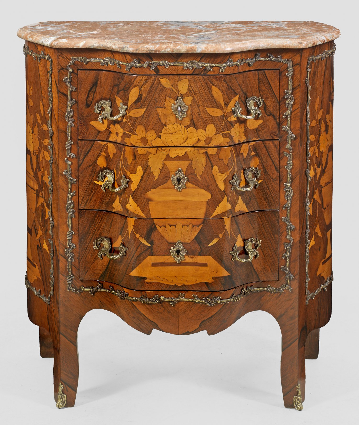 Napoleon III-Salonkommode Palisander, furniert sowie Einlagen aus Ahorn. Stark bombierter Korpus mit passig geschweifter Zarge, flankiert von schmalen Lisenen. In der gegliederten Front drei Schubfächer sans traverse. Flächendeckende Furnierfelder sowie großflächig angelegte Vasenmotive. Korrespondierende Deckplatte aus rotbraunem, hellgrau gemasertem Marmor. H. 92 cm. 83 cm x 46 cm.