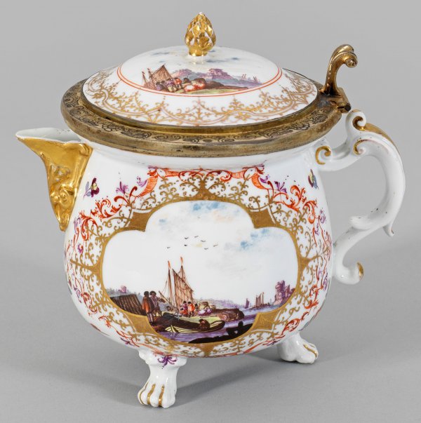 Buillontopf mit Kauffahrteiszenen Gebauchter Korpus auf drei plastischen Tatzenfüßen mit vergoldetem, blattreliefiertem Schnabelausguss und breitem Volutenhenkel. Auf gewölbtem Deckel plastischer Pinienknauf. Auf der Wandung und dem Deckel vierpassige, von Laub- und Bandelwerk in Purpur und Eisenrot gerahmte Goldornamentreserve mit Lüsterfond, darin szenische Darstellung weiter Flusslandschaften mit Architekturkulisse. Am Ufer liegende Großsegler bzw. Kaufleute zwischen anlandenden Waren beim Verhandeln über prall gefüllte Ballen und Fässer. Auf weißem Fond asiatische Blütengebinde. Äußerst feine polychrome Malerei mit reicher Goldstaffage. Ornamental gravierte, vergoldete Silbermontierung. Gest., Stadtmarke, Meister Elias Adam (1669 - 1745), Augsburg. Im Deckel und Boden Goldziffer 13. Schwertermarke. H. 15,5 cm.