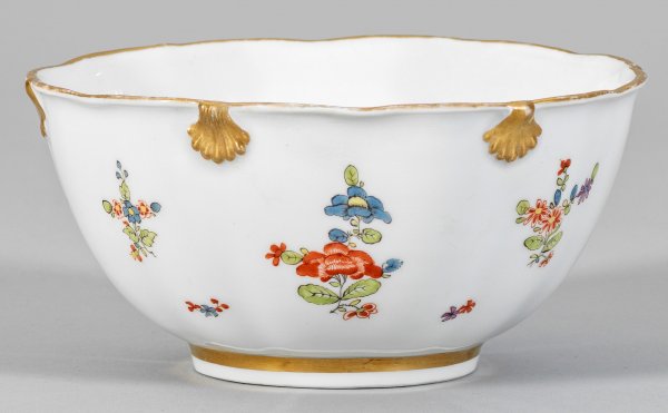 Zierkumme mit Kakiemondekor Runde, gemuldete Form mit sechsfach eingezogener Wandung sowie profiliertem Rand, reliefiert mit sechs vergoldeten Muscheln. Auf der Wandung feine Indianische Blütengebinde und Streublumen im Kakiemonstil. Korrespondierender Dekor im Spiegel. Polychrome Malerei in Eisenrot, Purpur, Emailblau, Moosgrün und wenig Gelb. Rand minim. rest.; Schwertermarke. H. 8 cm . D. 16,5 cm.