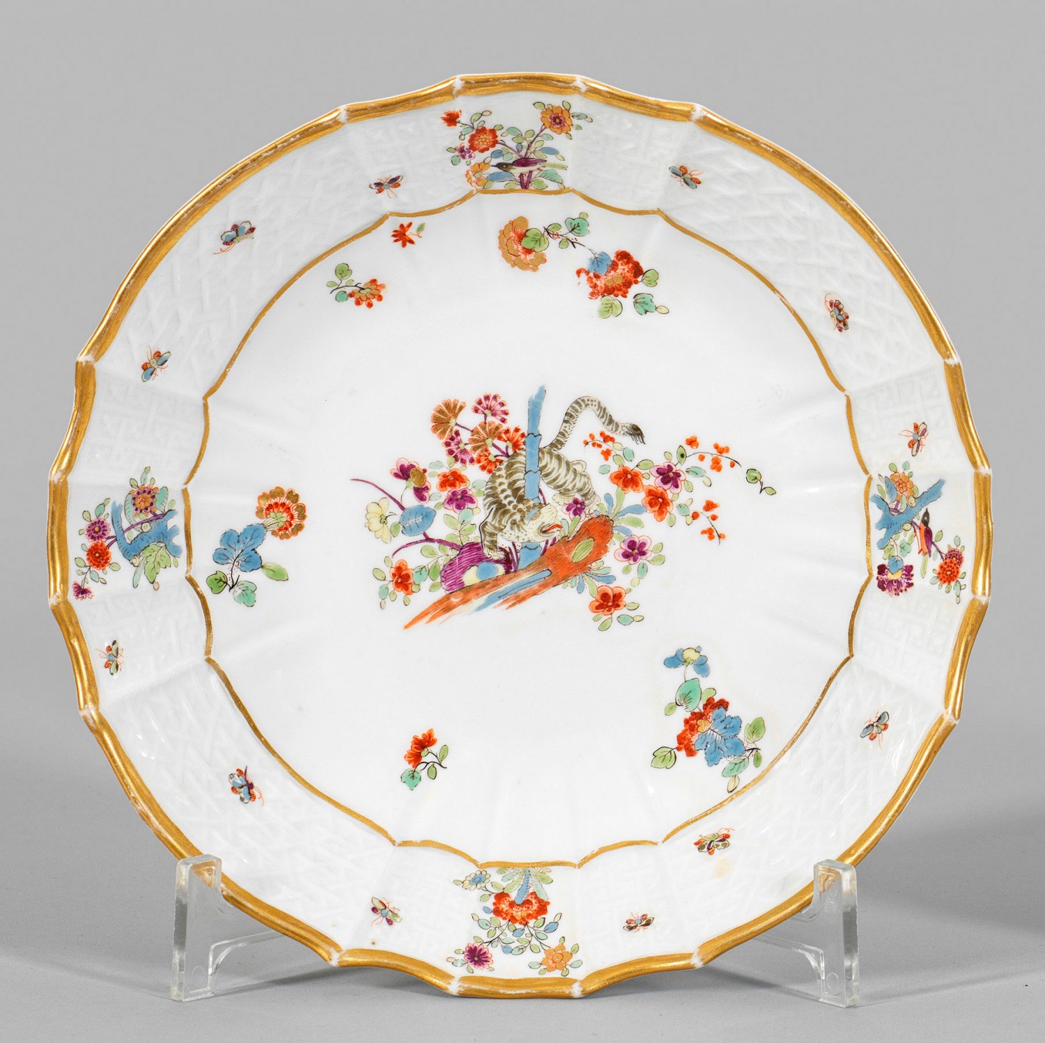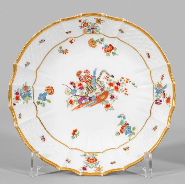 Zierschale mit Dekor "Gelber Löwe" Runde, tief gemuldete Form mit fasonniertem Rand. Im Spiegel feiner Kakiemondekor nach japanischem Vorbild mit gelbem Löwen (bzw. gestreiftem Tiger), sich um einen blauen Bambusstab windend. Umgeben von Indianischen Blütenzweigen. Umlaufender Reliefdekor "Alt-Brandenstein" mit Insekten im Wechsel mit Vogelmotiven und Prunuszweigen. Polychrome, teilw. Gold gehöhte Malerei. Goldkonturierung. Entw. Johann Friedrich Eberlein. Minim. ber.; Schwertermarke. D. 21 cm.