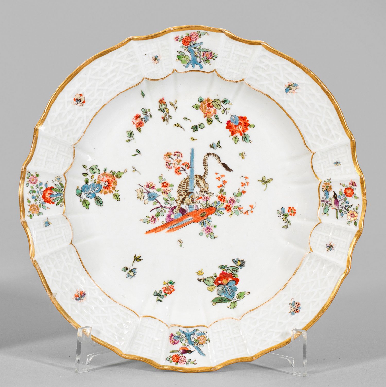 Zierteller mit Dekor "Gelber Löwe" Runde, flach gemuldete Form mit fasonniertem Rand. Im Spiegel feiner Kakiemondekor nach japanischem Vorbild mit gelbem Löwen (bzw. gestreiftem Tiger), sich um einen blauen Bambusstab windend. Umgeben von Indianischen Blütenzweigen. Auf der Fahne umlaufender Reliefdekor "Alt-Brandenstein" mit Insekten im Wechsel mit Vogelmotiven und Prunuszweigen. Polychrome, teilw. Gold gehöhte Malerei. Goldkonturierung. Entw. Johann Friedrich Eberlein. Minim. ber./best.; Schwertermarke. D. 24 cm.