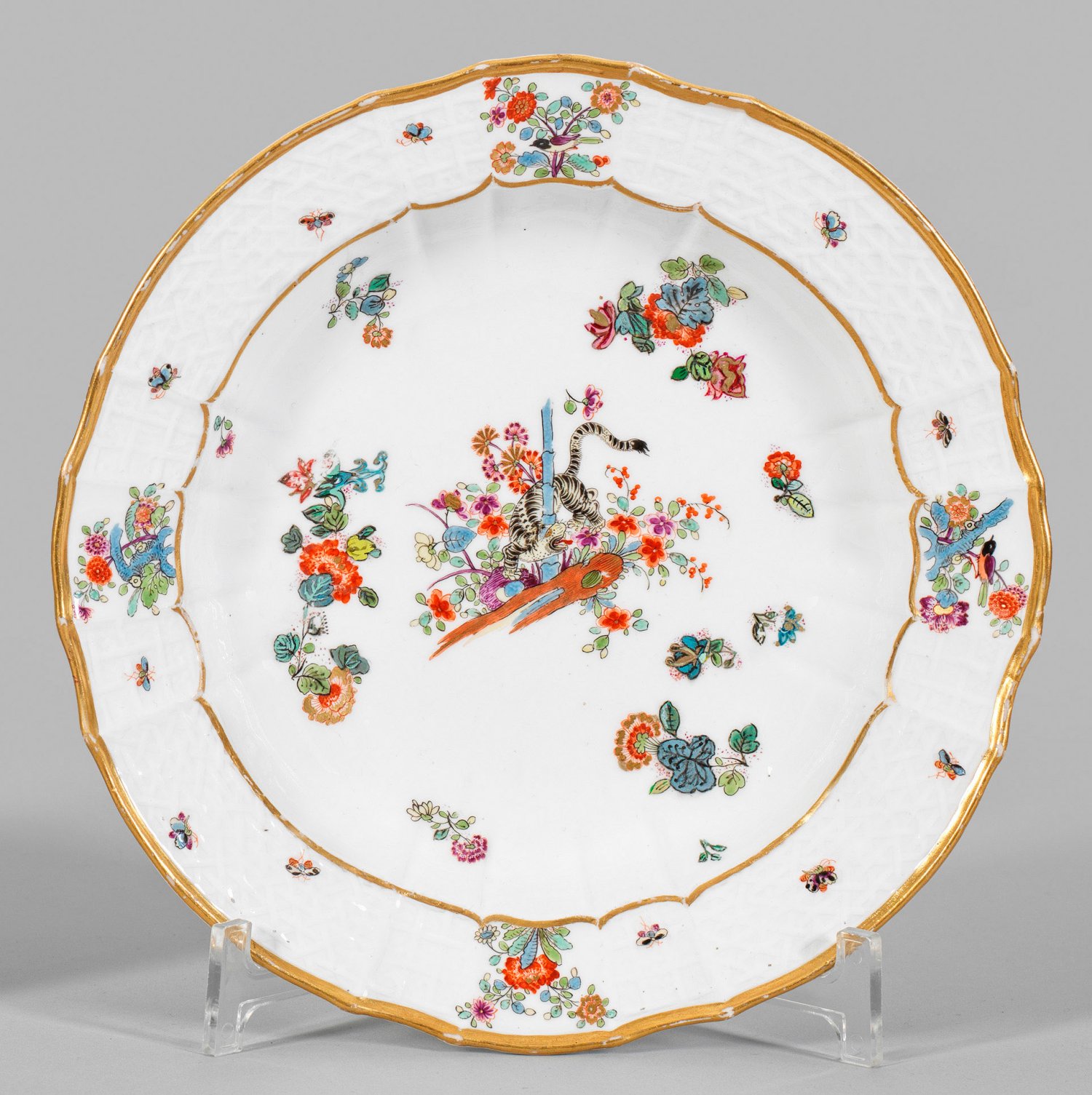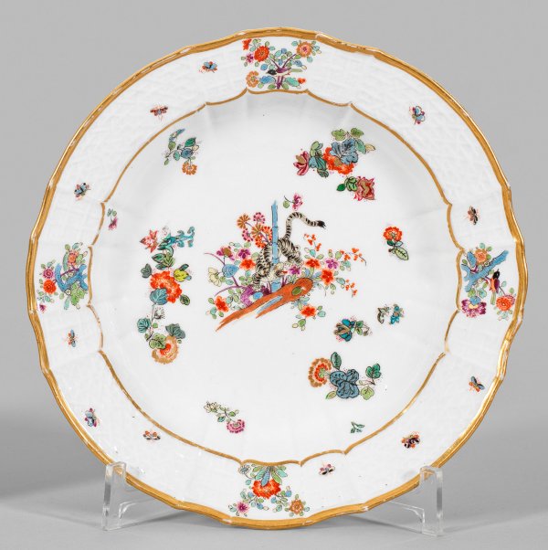 Zierteller mit Dekor "Gelber Löwe" Runde, gemuldete Form mit fasonniertem Rand. Im Spiegel feiner Kakiemondekor nach japanischem Vorbild mit gelbem Löwen (bzw. gestreiftem Tiger), sich um einen blauen Bambusstab windend. Umgeben von Indianischen Blütenzweigen. Auf der Fahne umlaufender Reliefdekor "Alt-Brandenstein" mit Insekten im Wechsel mit Vogelmotiven und Prunuszweigen. Polychrome, teilw. Gold gehöhte Malerei. Goldkonturierung. Entw. Johann Friedrich Eberlein. Minim. ber.; Schwertermarke. D. 23 cm.