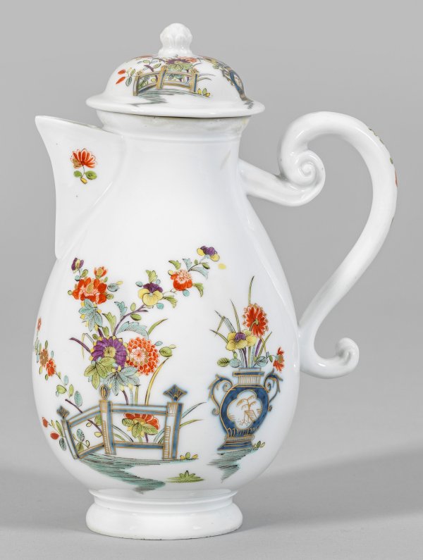 Kaffeekanne im Imaristil Birnförmiger Korpus mit Ohrenhenkel und Schnabelausguß mit herzförmiger Öffnung. Dekoriert auf beiden Seiten der Kanne und auf dem Deckel mit Blütenstaude hinter einem Zaun und Blumenvase mit indianischem Blütenstrauß nach Vorbild ostasiatischer Imari-Porzellane in Unterglasurblau, Rot, Gelb, Grün, Violett und Gold. Schwertermarke. H. 21,5 cm.