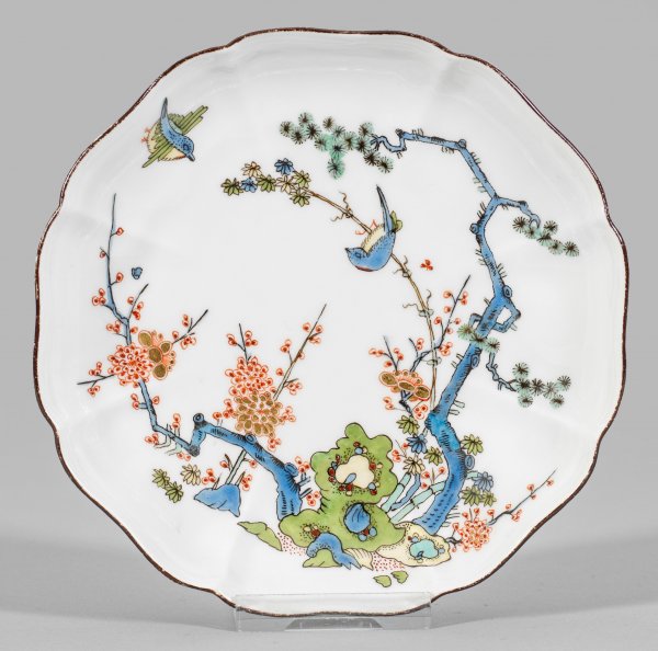 Kleine Schale mit Dekor "Drei Freunde im Winter" Runde, gemuldete Form mit blütenförmig geschweiftem, dunkelbraunem Rand. Im Spiegel, unweit eines grünen Felsen wachsender Prunus, Pinus und Bambus, die sog. "Drei Freunde im Winter" im Kakiemonstil. Auf einem Ast sitzender sowie ein weiterer herbeifliegender Japanbuschsänger. Feine poylchrome, Gold gehöhte Malerei. D. 12,5 cm.