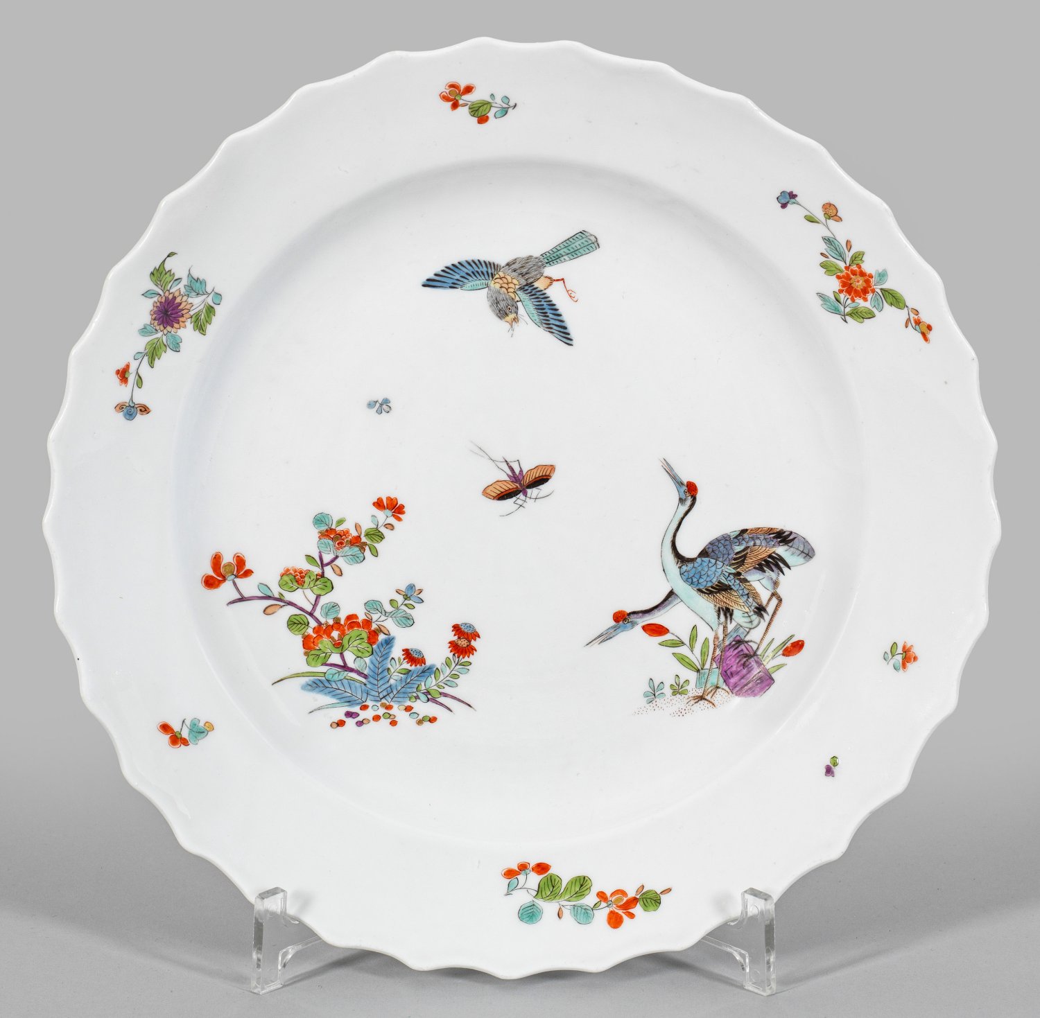 Runde Form mit wellenartig eingezogenem Rand. Im leicht vertieften Spiegel zwei, an einem Ufer stehende Kraniche, umgeben von Päonienzweigen, einem fliegenden Phönix und Insekten. Auf der Fahne feiner Dekor aus Chrysanthemen- und Päonienzweigen im Wechsel mit gestreuten Blüten. Polychrome, Gold gehöhte Malerei im Kakiemonstil. Minim. rest.; Schwertermarke. D. 28,5 cm.