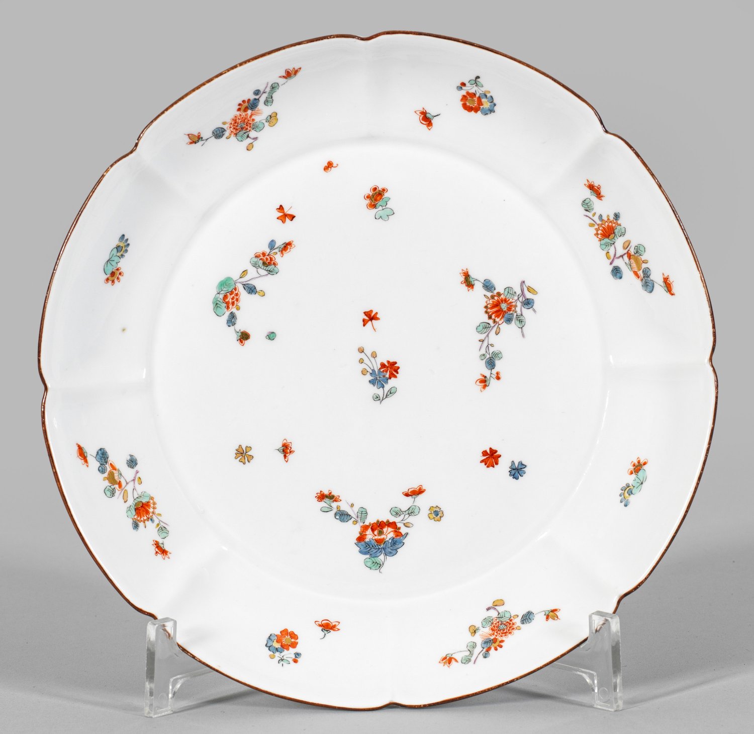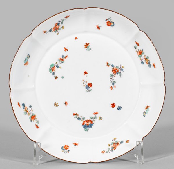 Presentoir mit Kakiemondekor Runde, flach gemuldete Form mit passig eingezogener Wandung. Kapuzinerbraun staffierter Rand. Im Spiegel und auf der Fahne Streublumendekor im Kakiemonstil aus Päonien- und Chrysanthemenzweigen. Polychrome, Gold gehöhte Malerei in Eisenrot, Seegrün, Emailblau mit wenig Gelb und Schwarz. Haarriss. Schwertermarke. D. 22 cm.