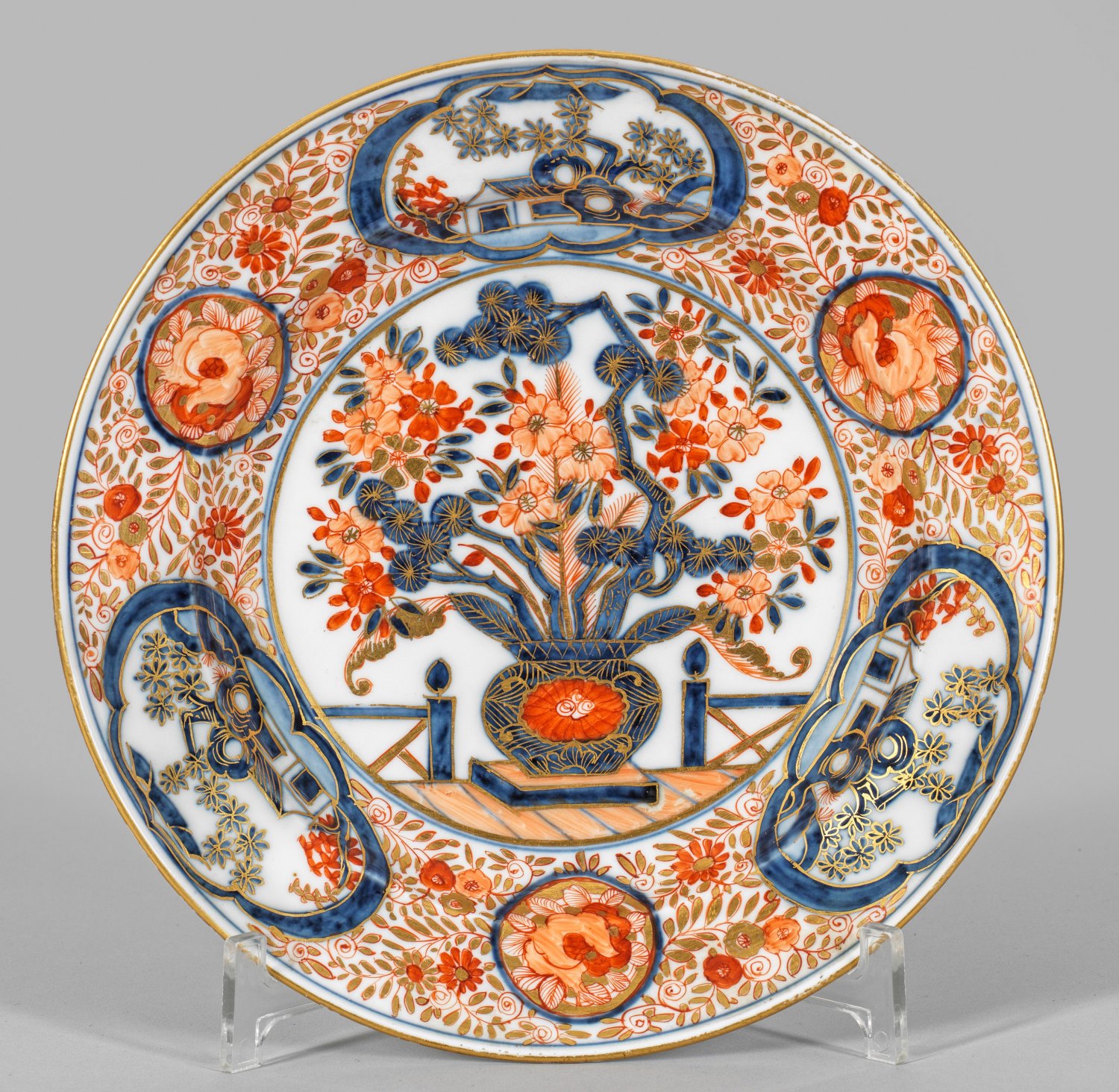 Teller mit Brokatdekor im Imaristil nach japanischem Vorbild. Im Spiegel ein großer Blumentopf auf einer Veranda. Die Fahne flächig mit Blüten- und Blätterzweigen dekoriert, dazwischen drei große Bildreserven mit Haus- und Baummotiv sowie drei kleine Blütenmedaillons. Tellerunterseite mit umlaufendem Blütenzweig und blauen Ringen dekoriert. Bemalt in Unterglasurblau, Eisenrot, Orangegelb und Gold. Schwertermarke, Beizeichen MÖ (für Blaumaler Möbius sen. oder jun.). D. 22,5 cm.