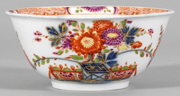 Zierkumme mit Tischchenmuster Leicht gebauchter Korpus mit geweitetem Lippenrand. Auf der Schauseite sog. Tischchenmuster mit farbenprächtigen, emporwachsenden Chrysanthemen- und Päonienblüten, rückseitig asiatische Vase mit Blumenzweigen. Unterglasurblaue, in Gold gehöhte Malerei, überdekoriert in Purpur, Eisenrot, Gelb und Moosgrün. Umlaufende Innenrandbordüre aus Mosaikmuster und Blütenreserven. Formerzeichen. Blaumalerzeichen K wohl für Johann David Kretzschmar (tätig 1726-52). Sammlungsetikett. Schwertermarke. H. 8,5 cm. D. 17 cm.