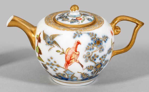 Kugelförmiger Korpus mit J-Henkel. Auf der Wandung sog. Fels- und Vogeldekor in unterglasurblauer Malerei, überdekoriert mit polychromer Hausmalerei in der Art der F. J. Ferner-Werkstatt. Goldspitzenbordüre und -staffage. Rest.; Schwertermarke. H. 10 cm. 17 cm x 10 cm.