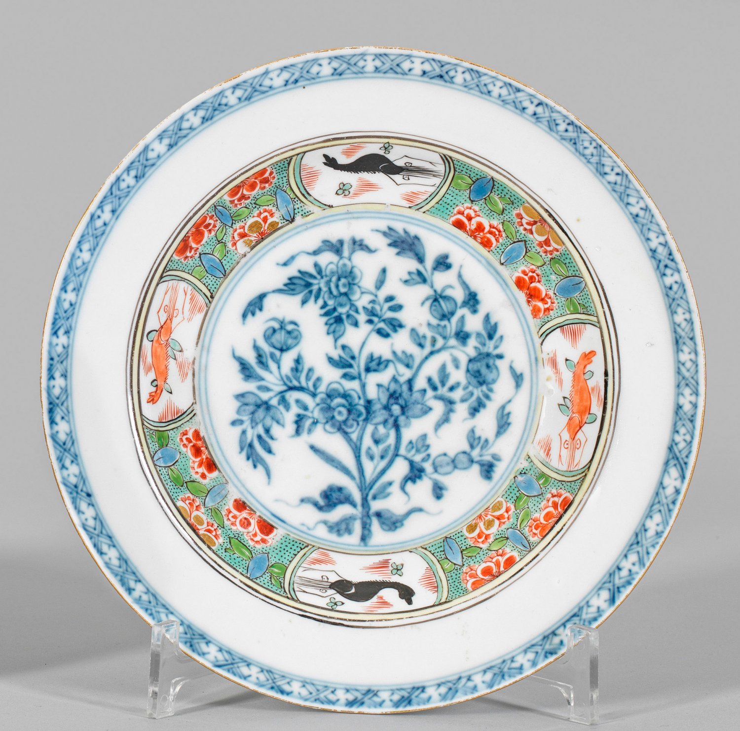 Teller mit Hummerdekor Im Spiegel dekoriert mit einem indianischen Blütenstrauch, in der Kehle vier Reserven mit roten und schwarzen Krebstieren, nach denen der Dekor "Hummerdekor" genannt wird. Tellerrand mit Gitterbordüre abgesetzt. Bemalt in Unterglasurblau, Rot, Blau, Grün, Schwarz und Gelb. Schwertermarke, unterglasurblaues Beizeichen k. D. 22 cm.