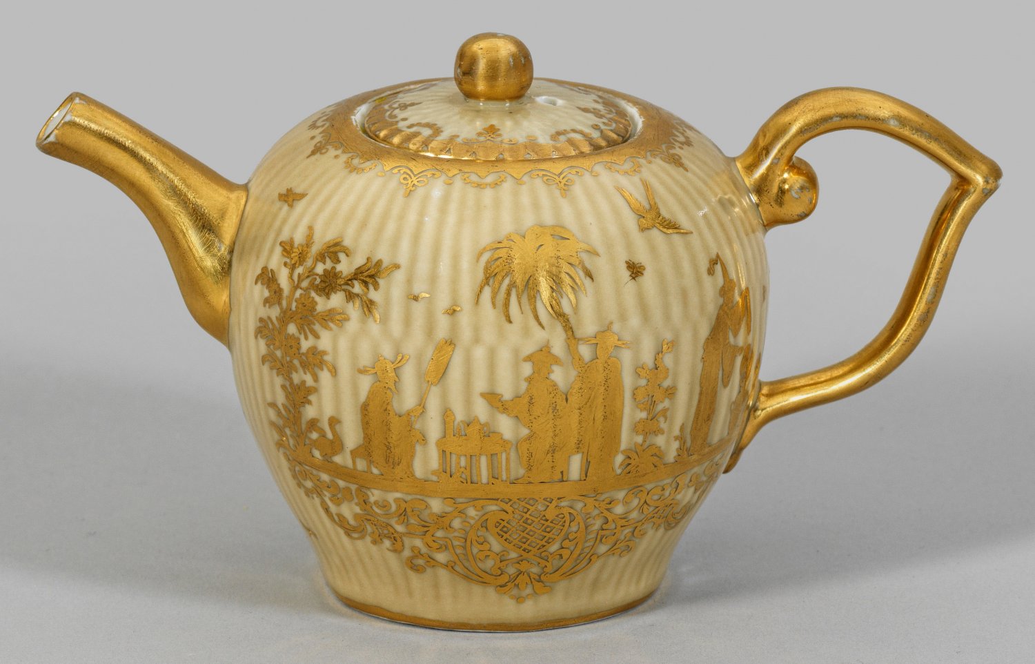 Kleine Teekanne mit Augsburger Goldchinesen Kugeliger Korpus mit facettiertem, vergoldetem Röhrenausguss sowie j-förmigem Volutenhenkel. Flacher, eingelassener Deckel mit Kugelknauf. Auf der Wandung flächendeckender Reliefdekor "Gebrochener Stab" mit Seladonglasur. Beidseitig der Wandung Chinoiseriedekor auf breiten ornamentierten Konsolen aus Laub- und Bandel- sowie Gitterwerk. Szenische Darstellungen von festlich gekleideten Chinesen in asiatischen Gartenlandschaften während der Teezeremonie bzw. konversierend zwischen blühenden Bäumen. Umlaufende Goldornamentbordüren aus C-Schnörkeln und Punktrücken. Radierte Goldmalerei von Abraham Seuter oder Werkstatt in Augsburg. Dreherzeichen für Johann Christoph Heßes (Heße). Schwertermarke. H. 10,5 cm.