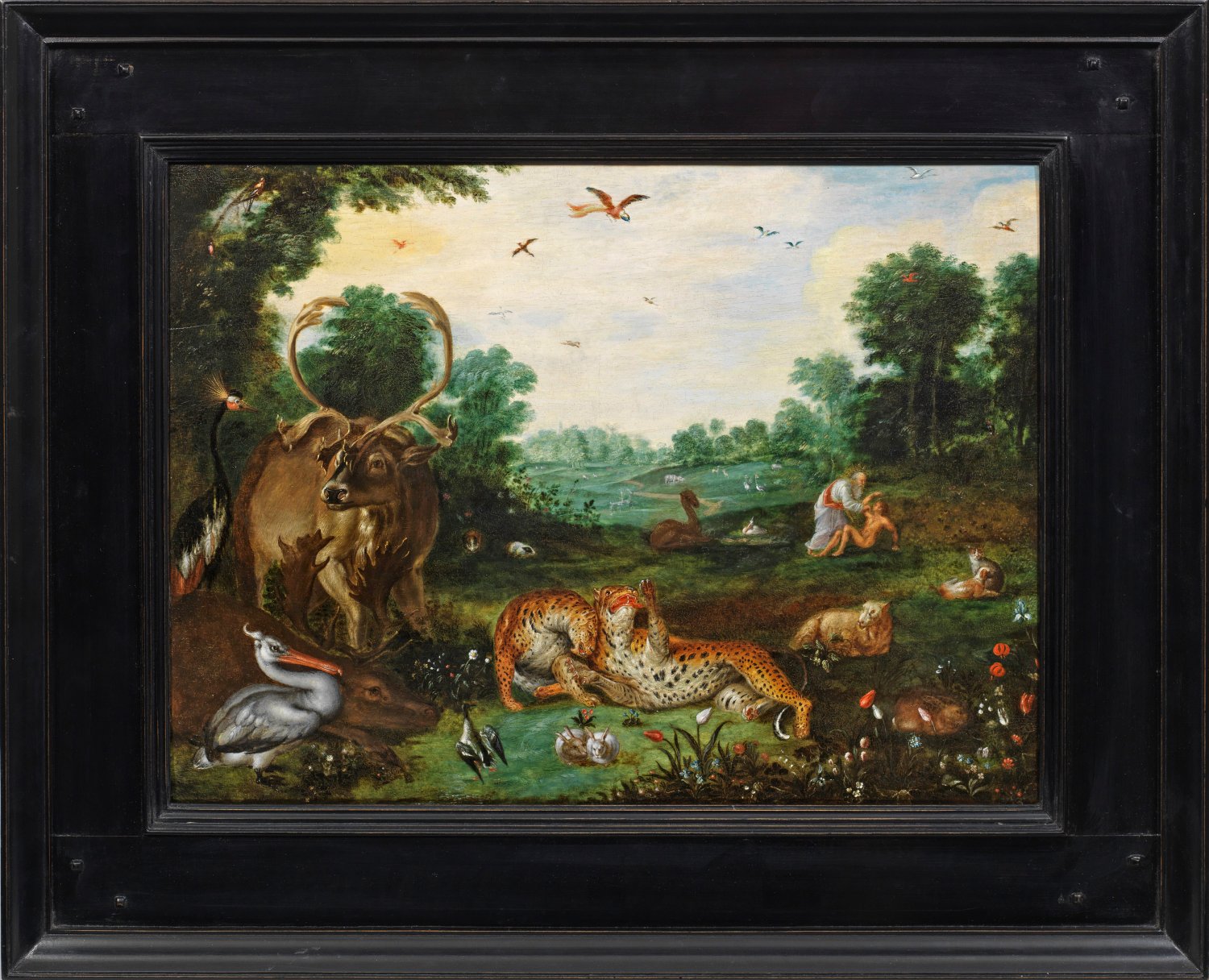 Brueghel schildert das Paradies als eine weite, morgendliche, baumbestandene Landschaft, die von diversen, aus den unterschiedlichsten, nördlichen und südlichen Weltregionen stammenden Tierarten belebt ist - darunter Kronenkranich, Damhirsch, Rentier, Pelikan, Leoparden, Meerschweinchen, Hund und Katze, Kamel, Nashorn und Strauße. In diese komponierte er auf der rechten Bildseite im Mittelgrund die Erschaffung Adams durch Gottvater. Laut Gutachten von Dr. Klaus Ertz hat Jan Brueghel der Jüngere die gesamte Komposition einschließlich der Tiere und beiden Figuren gegen Ende der 1620er Jahre in Antwerpen gemalt. Das sehr gut erhaltene Tafelbild besticht durch den frischen und leuchtenden Eindruck der in lasierender und fein-pastoser Malerei aufgetragenen Farben sowie durch die malerische Qualität der überaus lebendig und naturnah geschilderten Tiere. Religiöse Themen aus dem Alten und Neuen Testament gehörten zum festen Repertoire des Malers. Brueghel schuf mehrere Werkreihen und Zyklen mit Paradieslandschaften, zu denen auch dieses Gemälde gehört. Während das Motiv der sich balgenden Leoparden und das hier friedlich nebeneinander ruhende antagonistische Paar Hund und Katze mehrfach im Oeuvre Breughels vorkommt, ist die Darstellung eines Rentiers höchst außergewöhnlich und einzigartig. Auch in der europäischen Grafik und Malerei des 16. und 17. Jhs., zumal vor der Entstehungszeit dieses Gemäldes, gehören Rentierdarstellungen zu den absoluten Seltenheiten. Es handelt sich um eine der frühesten Darstellungen dieser Spezies - vor Brueghel hat nur der weitgereiste Joris Hoefnagel (1542 - 1600) ein Rentier dargestellt, wie ein 1575-1585 entstandenes Aquarell aus dem Besitz Kaiser Rudolf II. belegt. Brueghel war sich zweifellos der Ausgefallenheit des exotischen Motivs bewusst, das deshalb neben dem Leopardenpaar auch die Szenerie im Vordergrund dominiert. Der große Realismus der Darstellung spricht dafür, dass Brueghel das außerhalb Skandinaviens überaus rare Tier in eigener Anschauung selbst gesehen und studiert hat. Rentiere waren in aristokratischen Tiergärten der Renaissance und des Barock zwar begehrte Sammel- und Schauobjekte, vermochten sich dem mitteleuropäischen Klima und den damaligen Haltungsbedingungen jedoch nur schlecht anzupassen und gingen nicht selten rasch ein. Brueghel dürfte das im Gemälde geschilderte Rentier in der berühmten Menagerie des Brüsseler Schlossparks gesehen haben, das eine der bedeutendsten Sammlungen exotischer Tiere in Europa beherbergte und in der bereits sein Vater Jan Brueghel d. Ä. Tierstudien für dessen Paradieslandschaften betrieben hatte. Als Auftraggeber des Gemäldes ist ein hochgestelltes Mitglied des Hofes anzunehmen, der wie Rudolf II., Hoefnagel und Brueghel selbst vom Rentier fasziniert war und die in der flämischen Malerei des 17. Jhs. einzigartige Darstellung dieses seltenen Tieres gewünscht haben dürfte. Öl/Eichenholztafel, parkettiert. 33,5 cm x 46,3 cm. Rahmen.