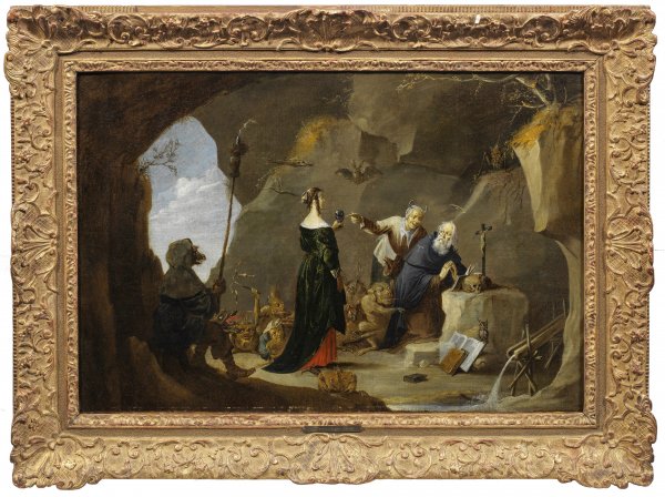 Darstellung des knienden, betenden Eremiten in einer Höhle, die sich im Hintergrund zu einem Himmel öffnet. Antonius wendet sich zur stehenden, jungen, verführerischen, elegant gekleideten Frau um, deren eigentliches teuflisches Wesen durch einen als Vogelklaue gebildeten Fuß offenbart wird. Sie hält ihm ein Glas entgegen, auf das überdies eine hinter dem Heiligen stehende gehörnte Hexe deutet. Bereichert wird die Szene durch diverse Mischwesen aus Menschen und Tieren sowie Bestien. Die Komposition basiert auf einem 1647 datierten Gemälde Tenier's, das sich einst im Kaiser-Friedrich-Museum bzw. in der Staatl. Gemäldegalerie in Berlin befand (seit 1945 verschollen). In der Tradition von Hieronymus Bosch, Pieter Brueghel d. Ä. und Jan Brueghel d. Ä. waren Antonius-Darstellungen im 17. Jh. weiterhin gefragt. Auch im Oeuvre Teniers' nehmen Antonius-Motive einen breiten Raum ein, ab ca. 1632 schuf er mit seiner Werkstatt eine Vielzahl unterschiedlicher Antonius-Gemälde. Öl/Lwd.; doubl.; Verso Sammler-Etiketten von Dr. A. Berg; Kat.-Ausschnitt oder Ausstellungs-Etikett von 1925/26. 56,5 x 83 cm. Rahmen.