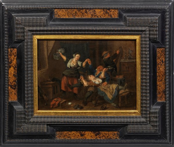 Szenische Darstellung eines ausschweifenden Gelages mit einer Gruppe von vier trunkenen Männern und Frauen. Jan Steen hat, wie sein Zeitgenosse Adriaen van Ostade, mehrfach moralisierende Interieurs mit Zechern geschildert. Öl/Eichenholztafel. 21,5 cm x 28,7 cm. Rahmen.
