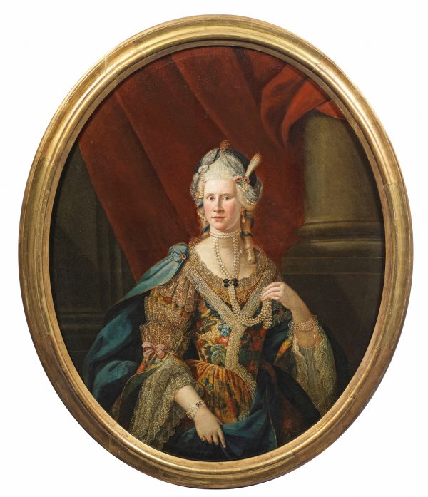 Ovales, lebensgroßes, repräsentatives Bildnis einer Adeligen zur Zeit Zarin Katharina II. (der Großen) von Russland mit kostbarem Schmuck in einem prunkvollen, höfischen, mit feiner Spitze verzierten Brokatkleid, die einen orientalisch anmutenden, turbanartigen Kopfschmuck trägt. Der Charme und die künstlerische Qualität des Gemäldes liegen außer in der opulenten Stofflichkeit ihres Kostüms insbesondere in der feinfühligen Charakterisierung der Figur und der subtilen Modellierung des weichen Gesichtes durch ein nuanciertes Inkarnat. Öl/Lwd.; 133 cm x 104 cm, im Oval. Rahmen.