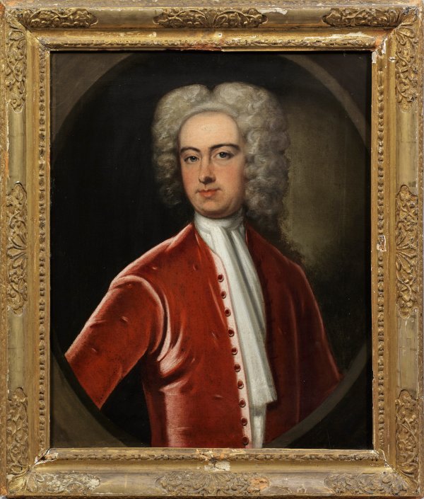 Das ausdrucksstarke um 1745 gemalte Brustbild zeigt einen Herren mit gepuderter Rokokoperücke und roter Samtjacke. Öl/ Lwd. doubl.; 76 cm x 63 cm. Rahmen besch.