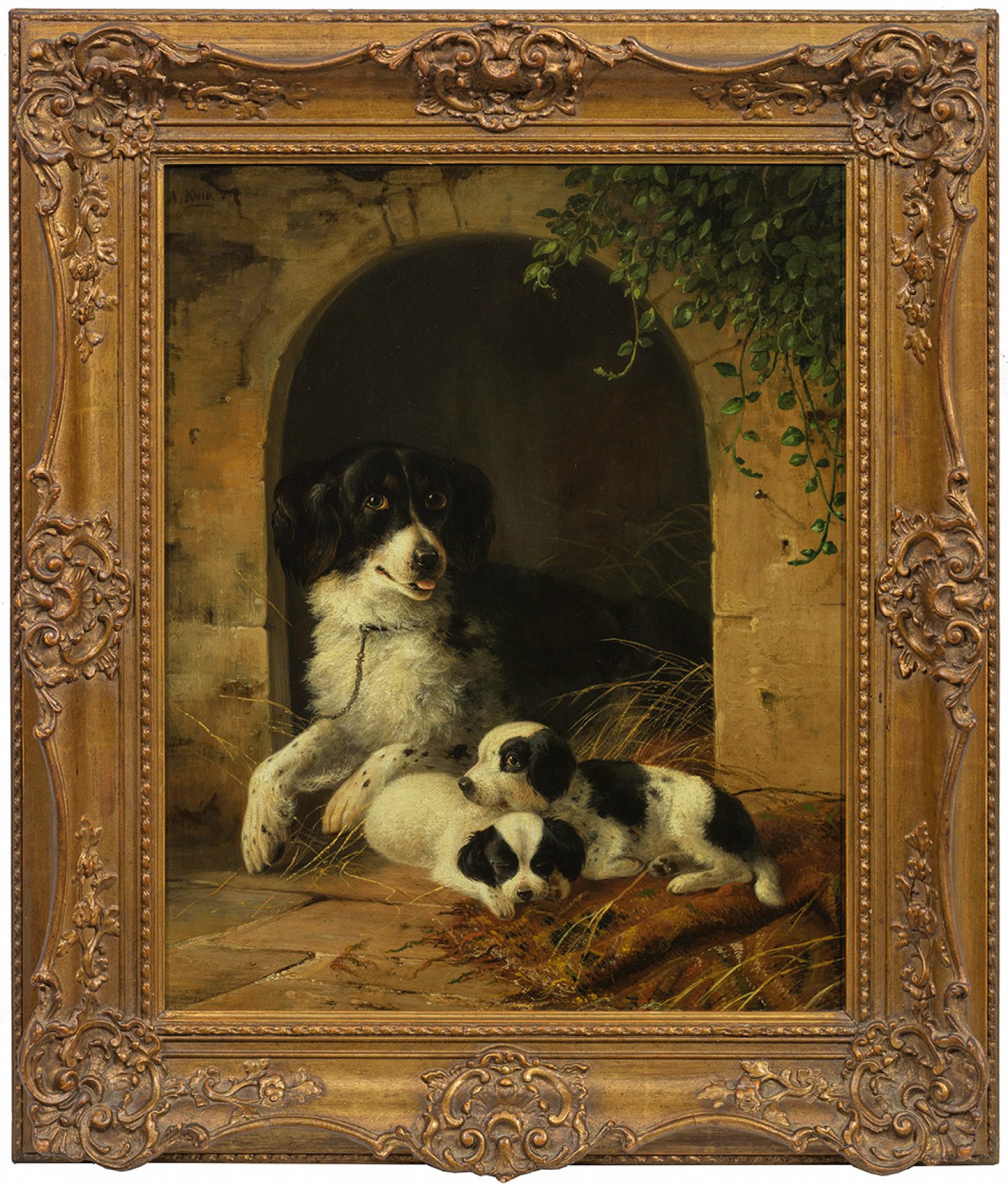 Stimmungsvolles, charakteristisches, lebendig geschildertes Tierbild des Künstlers, der bei seinem Vater Joseph Aug. Knip lernte. Nach seiner Tätigkeit in vielen Orten der Niederlande war er ab 1852 in Baden Baden ansässig. Öl/Mahagonitafel. L. o. sign.; 52 cm x 42,5 cm. Rahmen.