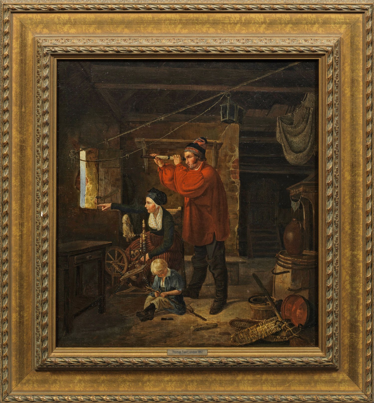 In einer ärmlich möblierten Fischerhütte eine am Spinnrad sitzende Frau, bastelnder Sohn und mit dem Fernrohr aus dem Fenster nach Schiffen spähender Vater. Über ihnen eine ausfahrbare Leuchtfeuervorrichtung, die für küstennahe Schiffe, die die Hafeneinfahrt oder eine Riffdurchfahrt suchen, als Irrlicht verwendet werden kann. Wenn ein Boot am Fels zerschellt, wird es von den Riffpiraten geplündert. Solche Art erzählende Genremalerei, die den Betrachter unmittelbar aufruft, sich den Fortgang der Ereignisse auszumalen, waren im viktorianischen Zeitalter sehr verbreitet. Öl/Lwd.; R. M. sign.; 50,5 cm x 47,5 cm. Rahmen.
