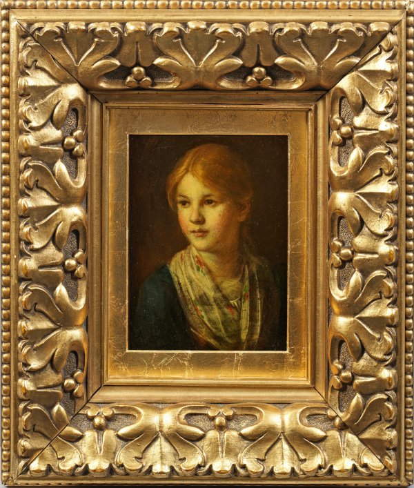 In Motiv und Stil repräsentatives, fein gemaltes Bildnis. Gesicht und das transparente Brusttuch werden durch eine effektvolle Lichtregie betont. Defregger studierte ab 1861 an der Kunstakademie in München und war Mitarbeiter im Atelier von Carl von Piloty. Nach ersten Austellungserfolgen 1868/69 avancierte Defregger rasch zu einem der gefragtesten Genremalern seiner Zeit. Zu seinen Verkaufsschlagern zählen bis heute feinfühlige Porträts und Genreszenen der Tiroler Landbevölkerung, bevorzugt Bäuerinnen, deren natürliche Anmut und Lebenswahrheit das städtische Publikum begeisterte. Öl/Malkarton. L. u. sign.; 22 cm x 17 cm. Rahmen.