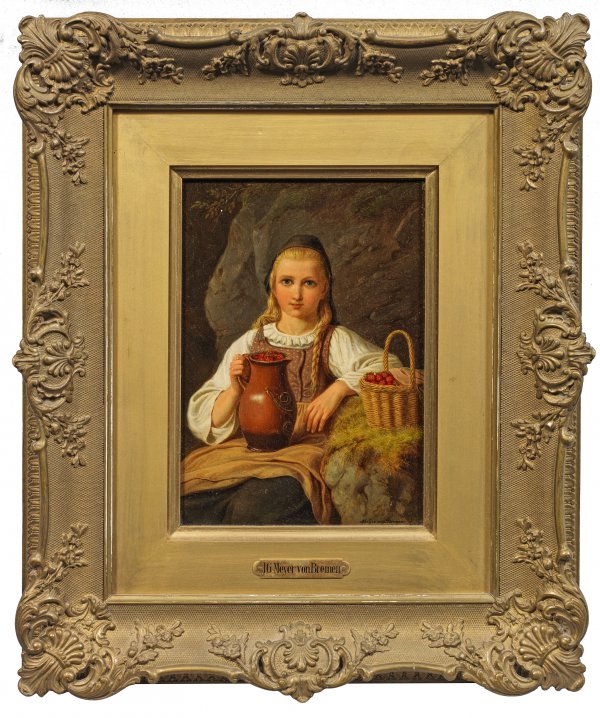 Ein junges Mädchen sitzend vor einer Felswand, den linken Ellbogen auf einen mit Moos bewachsenen Stein aufgestützt, einen mit Erdbeeren befüllten Steinzeugkrug auf dem Schoß haltend. Neben ihr steht ein ebenfalls mit Erdbeeren gefüllter Korb. Der schüchterne, aber konzentrierte Blick und die akkurate Körperhaltung zeigen, dass sie dem Maler Modell sitzt. Johann Georg Meyer, der sich nach seiner Geburtsstadt von Bremen nannte, studierte an der Düsseldorfer Kunstakademie und hatte bis 1851 ein Atelier in Düsseldorf, bevor er nach Berlin übersiedelte, wo er 1854 Professor an der Kunstakademie wurde. Mit seinen Genredarstellungen aus der Welt der Kinder erlangte er große Anerkennung. Öl/Holz. R. u. sign.; 20,8 cm x 15,4 cm. Rahmen.