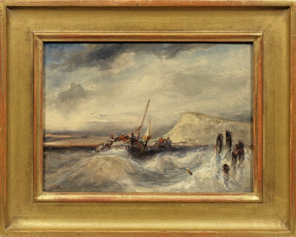 In lockerem, offenem Pinselduktus gemaltes Kabinettbild mit Studiencharakter. Der Maler fokussiert sich auf das von Wellen hin- und hergeworfene Segelschiff und ein zur Hilfe nahendes Ruderboot, während Wasser und Himmel in diffuser, atmosphärischer Auflösung verbleiben. Hildebrandt, ein weitgereister Maler, der zeitlebens Küstenlandschaften favorisierte, hielt sich 1841 in Paris bei Eugène Isabey auf, dessen Marinebilder starken Einfluss auf ihn ausübten. Öl/Holz. L. u. monogr. u. dat. "18 EH 41". 21 cm x 29 cm. Rahmen.