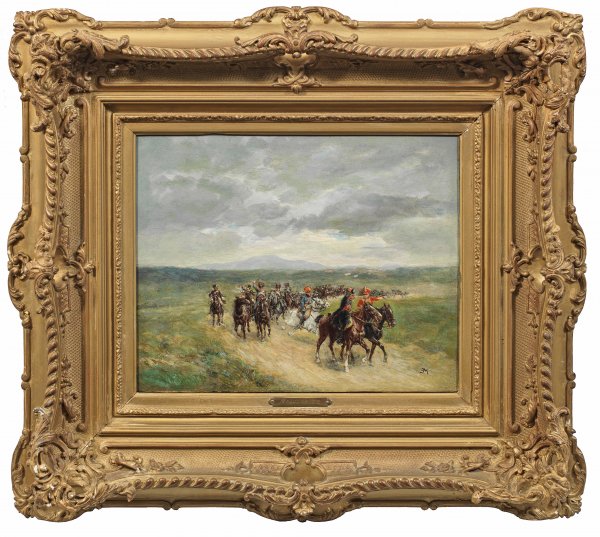 Blick auf ein in weiter, hügeliger Landschaft reitendes Eskadron, wohl der Grande Armée während der Napoleonischen Kriege, mit Soldaten auf teilw. schnell galoppierenden Pferden. Trotz des relativ kleinen Formats gelingt es Meissonier durch die virtuose Feinmalerei mit Bravour einen lebendigen Ausdruck der Pferde, Figuren und der Bewegung zu vermitteln. Der Künstler lernte im Atelier des Malers Léon Cogniet und wurde insbesondere durch seine mit Raffinement gemalten Darstellungen aus der aktuellen französischen Militärgeschichte und der Feldzüge Napoleon I. und Napoleon III. berühmt. Hierdurch wurden ihm höchste offizielle Ehrungen zuteil - darunter die Aufnahme in die Ehrenlegion mit Ernennung bis zum Großkreuzträger. Öl/Holztafel. R. u. Ligatur-Monogr. "EM;" mit gespiegeltem "M". Verso Galerie-Etikett des 19. Jhs. mit typographischer Bez. "TABLEAUX MODERNES (/) TESDESCO FRÈRES (/) EXPERTS (/) 33, AVEN(UE DE L'O)PERA PARIS" und Sammler-Etikett in Kyrillsch. 23 cm x 29 cm. Rahmen.