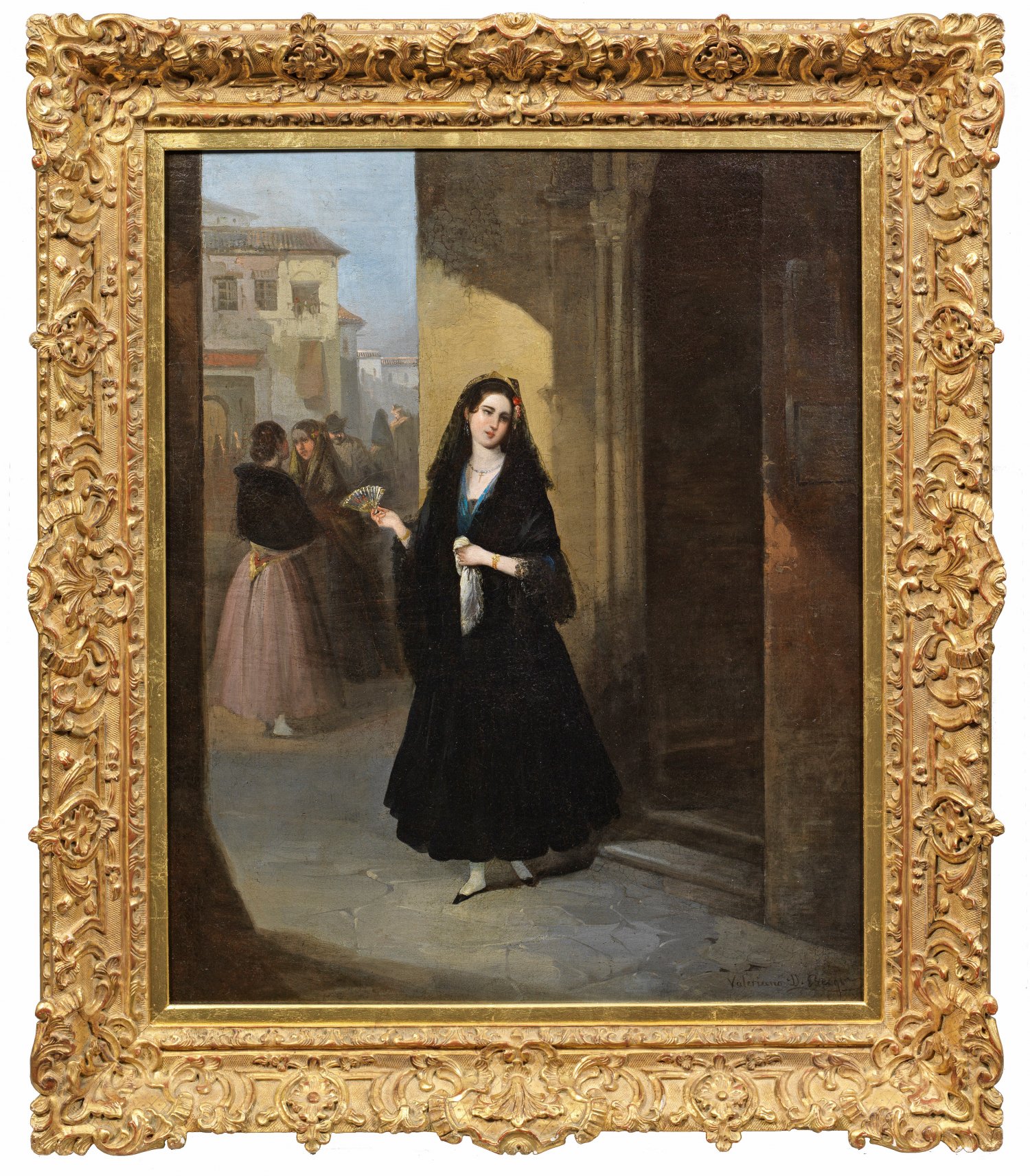 Szene vor einem Hauseingang, im Hintergrund ein belebter Platz. Fein gemaltes, spätromantisches, wohl um 1855 entstandenes Werk des Künstlers. Dieser stammte aus einer Malerfamilie und lernte bis 1853 bei seinem Onkel Joaquín Domínguez Bécquer in Sevilla, später studierte er bei Antonio Cabral Bejarano an der Kunstschule in Sevilla. In diesem Gemälde ist deren Einfluss augenfällig - beide gehörten (wie auch Valeriano Dominguez Bécquer selbst) zu den sog. "Costumbrista", die insbesondere Motive aus dem spanischen Volksleben darstellten. Im Jahr 1865 erhielt er den Regierungsauftrag, Szenen von Festen, Kostümen und Bräuchen in den verschiedenen spanischen Regionen zu malen, das zu mehrjährigen Reisen führte. Das Projekt blieb jedoch wegen des 1868 begonnenen Streits um die spanische Thronfolge unvollendet. Öl/Lwd.; R. u. sign.; 84,5 cm x 54,5 cm. Rahmen.