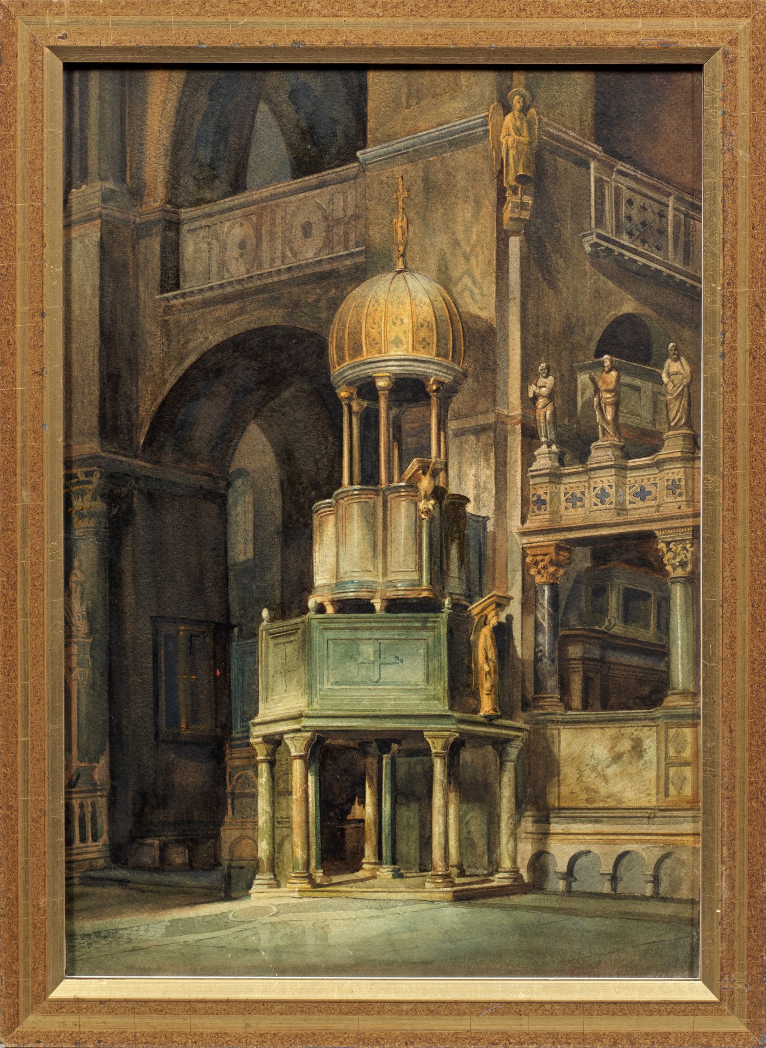 Stimmungsvolle Architekturvedute mit subtiler Wiedergabe der Lichstimmung. Seltenes, während (oder nach) einer Studienreise nach Italien entstandenes Werk des Künstlers, der an den Akademien in Antwerpen und Brüssel u. a. bei Nicaise de Keyser studierte. Aquarell/Papier. R. u. sign. u. dat. 1861(?). 46 cm x 32,5 cm. Rahmen.