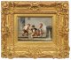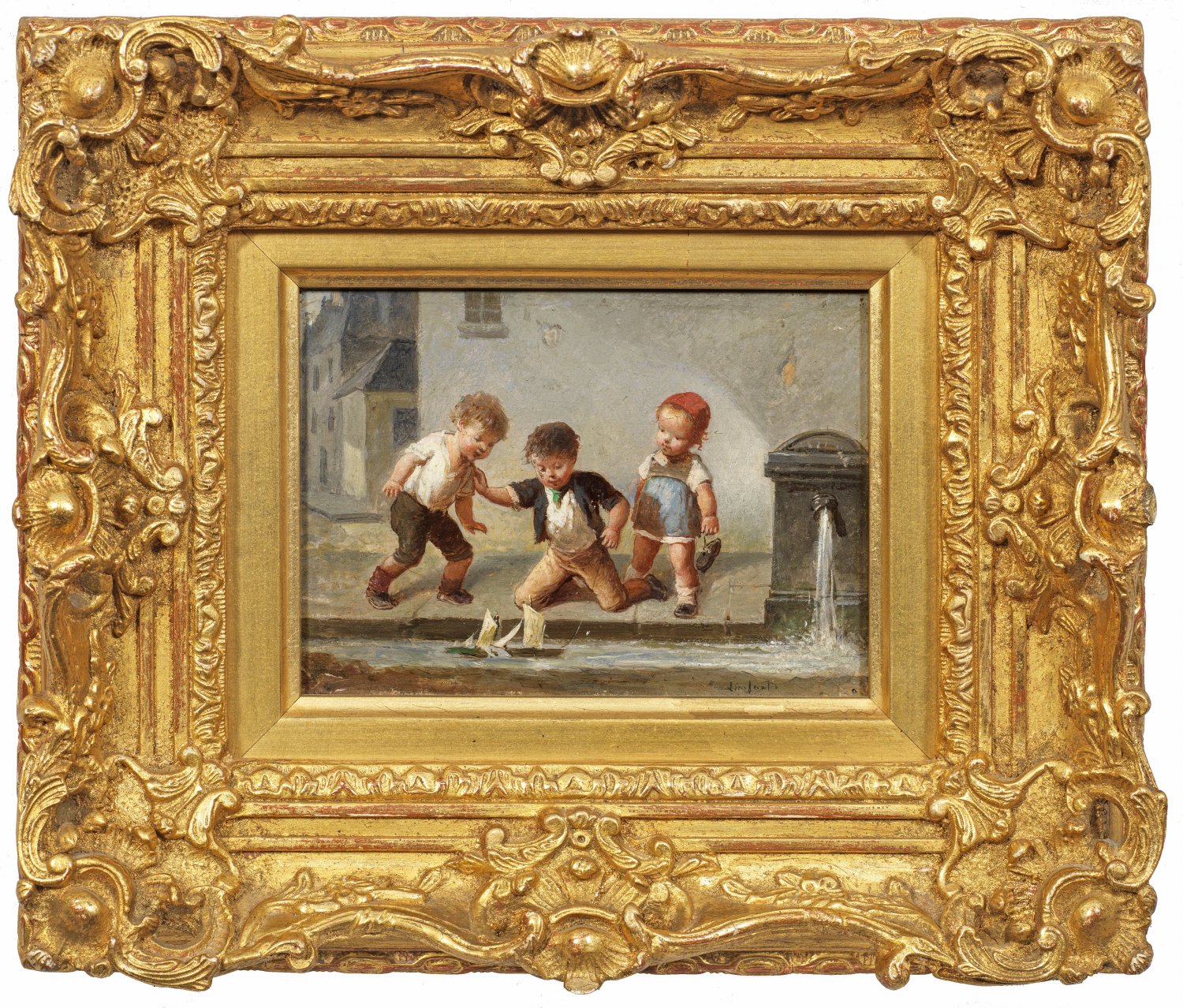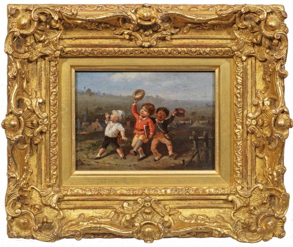 Pendants. Eines der beiden sehr fein gemalten Tafelbilder zeigt drei fröhlich beschwingte Schulkinder auf dem Heimweg von der Schule. Das zweite Bild mit zwei rangelnden Jungen und einem kleinen Mädchen beim Papierschiffchenfahren im Rinnstein. Der Künstler war auf humorvolles Kindergenre in kleinem Format spezialisiert. Besonders reizte ihn die Darstellung von Schelmenstreichen und kleinen Malheurs. Öl/Holz. L./r. u. sign.; 10,5 cm x 15 cm. Rahmen.