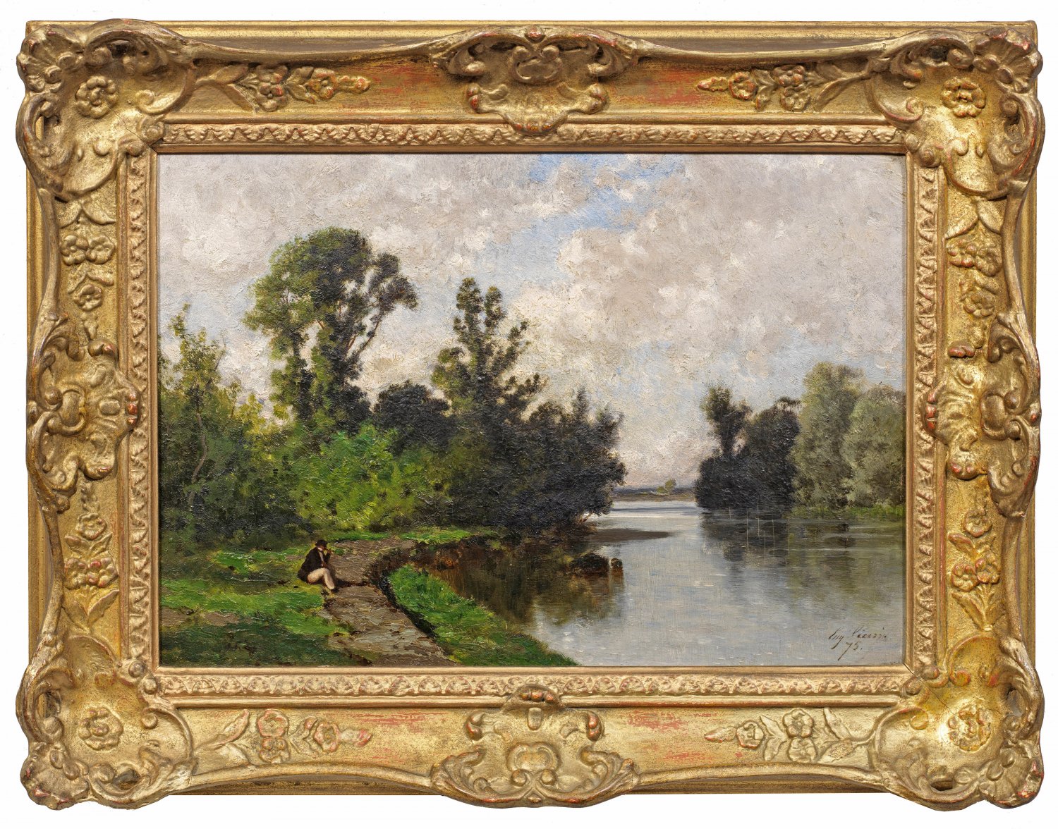 Atmosphärisch gestimmtes Werk des von der Schule von Barbizon geprägten Landschaftsmalers, der aus einer Künstlerfamilie stammte - er war ein Enkel von Jean-Baptiste Isabey und zugleich Neffe des nur Jahre älteren, befreundeten Eugéne Isabey. In den 1840er Jahren wohnte er mit E. Isabey in Paris, wo beide von ihren Nachbarn Théodore Rousseau, Jules Dupré, Narcisse Diaz, Johan Barthold Jongkind und Jean-François Millet beeinflusst wurden. 1851 debütierte Cicéri auf dem Salon in Paris. In den 1870er Jahren hellte sich sein Kolorit auf, er malte weite, locker bewölkte Himmel, die zunehmende Aufmerksamkeit auf atmosphärische Effekte und das Licht zeigen Parallelen zum Impressionismus. Öl/Mahagonitafel. R. u. sign. u. dat. (18)75. 24 cm x 35 cm. Rahmen.