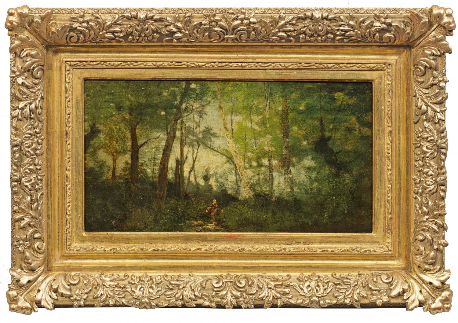 Effektvoller Blick auf den dichten Wald vor einem lichterfüllten Hintergrund. Das Gemälde spiegelt in Motiv, Komposition und Stil den prägenden Einfluss von Camille Corot (1796 - 1875) Narcisse Virgile Diaz de la Peña (1808 - 1876) als zwei der Hauptmeister der Schule von Barbizon wider. Mit ihren Darstellungen von Reisigsammlerinnen inspirierten sie zahlreiche Maler in Frankreich und Deutschland. Öl/Holztafel. L. u. sign.; 32 cm x 41 cm. Rahmen.