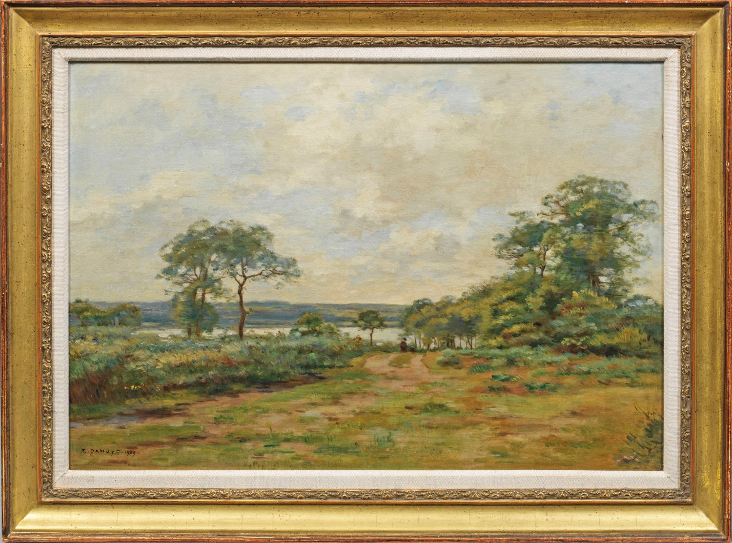 Vor einem tiefgelegten Horizont Felder mit vereinzelten Bäumen an einem Gewässer. Der aufgelockerte Wolkenhimmel gibt an einigen Stellen strahlendes Azur frei. Vom Motiv typisches dem Realismus verpflichtetes Landschaftsgemälde des Pariser Künstlers Damoye, der als Schüler von Corot und Daubigny gilt. In Nordfrankreich im Departement Pas-de-Calais fand er viele seiner Freilichtmotive. Öl/Lwd.; L. u. sign. und dat. 1909; 50 cm x 73 cm. Rahmen.