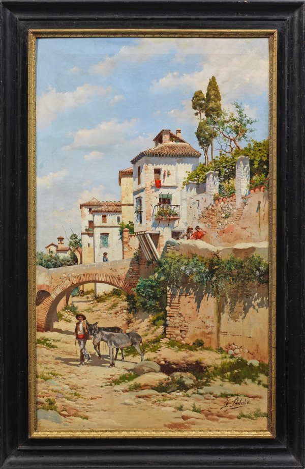 Blick auf ein pittoreskes, belebtes, hoch aufragendes Architekturensemble an einem trockengefallenen Fluss, den ein Bauer mit zwei Eseln als Weg benutzt. Belebt wird die Szenerie durch weitere Figuren auf einer kleinen Brücke bzw. am befestigten Uferweg. Lichtdurchflutete, atmosphärisch gestimmte Landschaftsvedute des Künstlers, der hierin das intensive mediterrane Licht wiedergibt. Sádaba Ramos schilderte vornehmlich Motive aus Granada mit der Alhambra sowie der Umgebung. Öl/Lwd.; 110,5 cm x 66 cm. Rahmen.