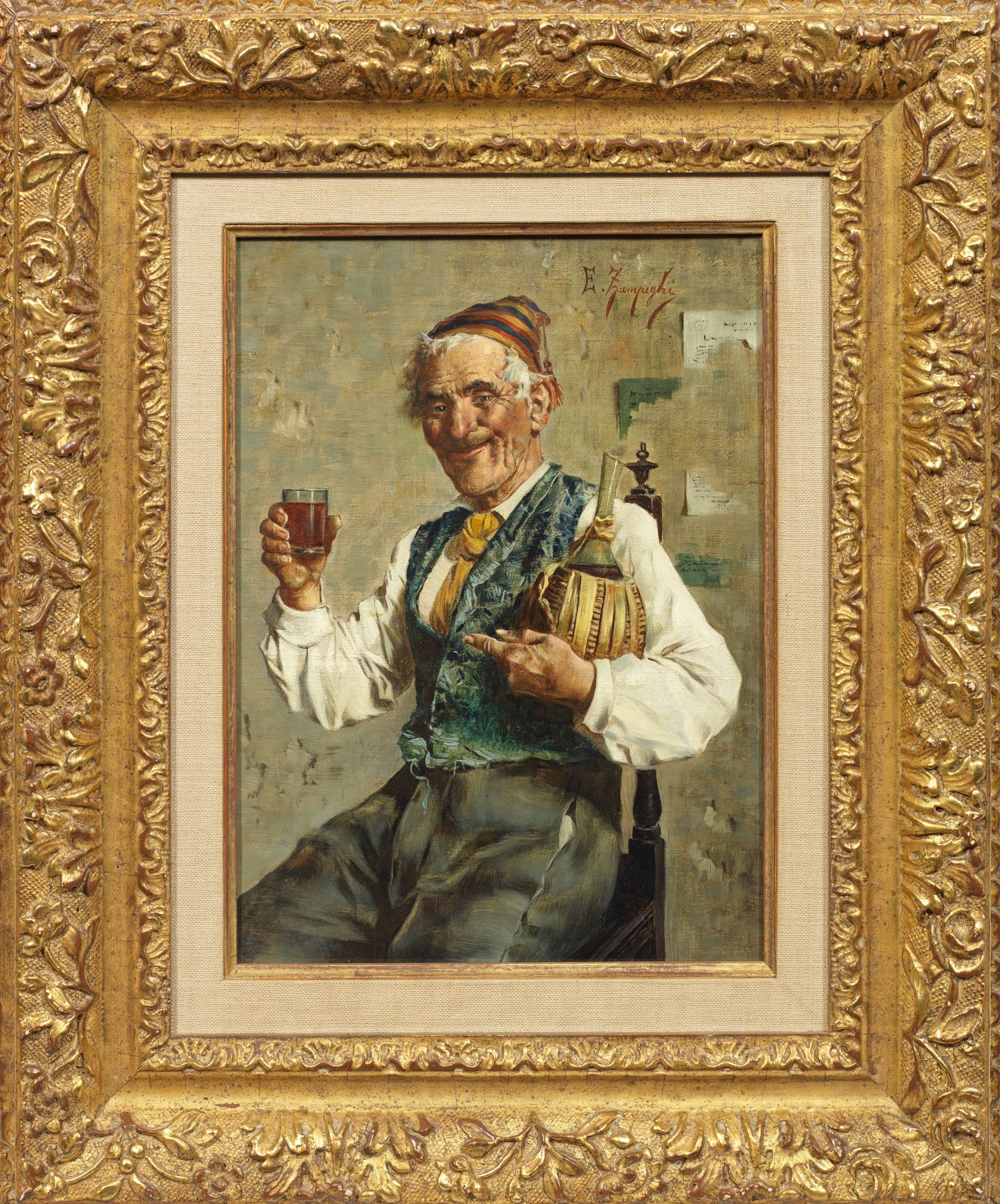 Genredarstellung mit fröhlichem alten Bauern, sich ein Glas Rotwein genehmigend, in unmittelbar lebensnaher Charakterschilderung und meisterhafter Wiedergabe von Stofflichkeit. In Motiv und Stil für Zampighi typisches Werk, der einer der bedeutendsten italienischen Genremaler seiner Zeit war. Er gewann 1879 als einer der besten Schüler der Kunstakademie Modena ein dreijähriges Stipendium, das er zunächst in Rom und später in Florenz verbrachte, wo er ab 1884 dauerhaft ansässig war. Sein Hauptsujet waren realistisch gemalte, feinfühlig beobachtete Szenen aus dem ländlichen, idyllischen Volksleben, das er in sehr subtiler, sympathischer Weise beobachtete. Öl/Lwd.; R. o. sign.; 30 cm x 22 cm. Rahmen.