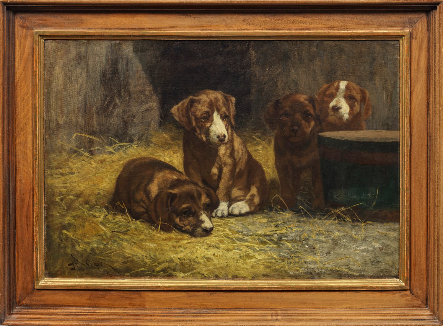 Eine Schar besorgt blickender Welpen erwarten die Rückkehr der Mutter. Charakteristisches, anrührendes Werk des amerikanischen Tiermalers Dolph, der sich nach seiner Ausbildung zum Porträtmaler in Cleveland in Antwerpen im Fach Tiermalerei weiterbildete und mit seinen einfühlsamen Katzen- und Hundebildern große Erfolge feierte. Öl/Lwd., doubl; L. u. sign.; 41 cm x 61 cm. Rahmen.