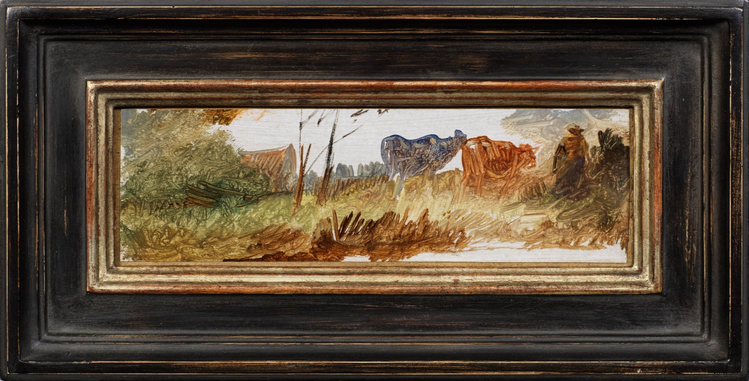 Mit schnellem, flüssigem Duktus und rhythmisch miteinander verwobenen Pinselstrichen gemalte Landschaft mit zwei Kühen, flankiert von einem Bauernhaus und einer Figur in Rückansicht. Das wohl um 1885-1890 gemalte, wie oft in Buschs Oeuvre kleinformatige Gemälde gehört zu einer größeren Werkreihe mit fast impressionistisch aufgefassten Landschaften und Weidemotiven. Außer Menschen ist kein anderes Motiv so häufig im Oeuvre des Künstlers wie Tiere, vor allem Kühe, die er nach der Natur zeichnete und mit seinen prägnaten Pinselstrichen in der Landschaft malte. Stilistisch ging Busch damit weit über die ihn prägende niederländische und flämische Malerei des 17. Jhs. hinaus, die er während seines Studiums 1852 an der Akademie in Antwerpen unmittelbar kennengelernt hatte. In den Sammlungen des Lenbachhauses in München, des Wallraff-Richartz--Museums in Köln, des Wilhelm Busch-Museums in Hannover und in der Staatl. Gemäldegalerie Neue Meister in Dresden befinden sich zahlreiche vergleichbare Gemälde. Öl/Papier, alt auf Karton kaschiert. Verso Klebezettel mit Bestätigung von Otto Nöldeke (Neffe des Künstlers), dat. Lüthorst, vom 20. April 1922. 6,1 cm x 20,2 cm. Rahmen.