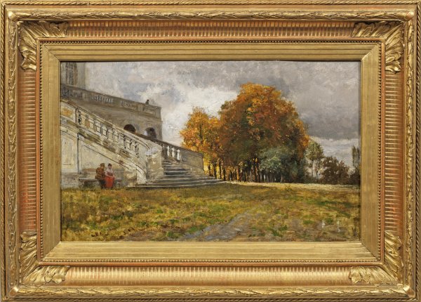 Impressionistische stimmungsvolle Landschaft mit repräsentativer Freitreppe, die von einer Schlossterrasse in einen Park hinabführt. Daneben ein Pärchen auf einer Bank sitzend. Rechts weitet sich der Blick auf eine Baumgruppe, die im goldenen Herbstlaub leuchtet. Charlemont, der an der Wiener Kunstakademie studierte, war ein vielseitiger Künstler. Neben seinen Porträt-, Tier- und Stilllebenbildern haben die spätimpressionistisch empfundenen Landschaften das Publikum besonders angezogen. Öl/Holz. R. u. sign.; 29,5 cm x 49 cm. Rahmen.//